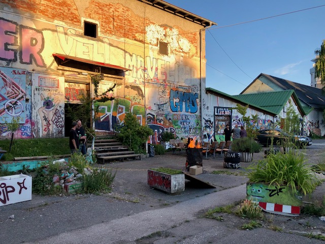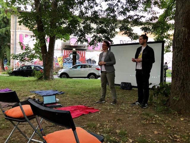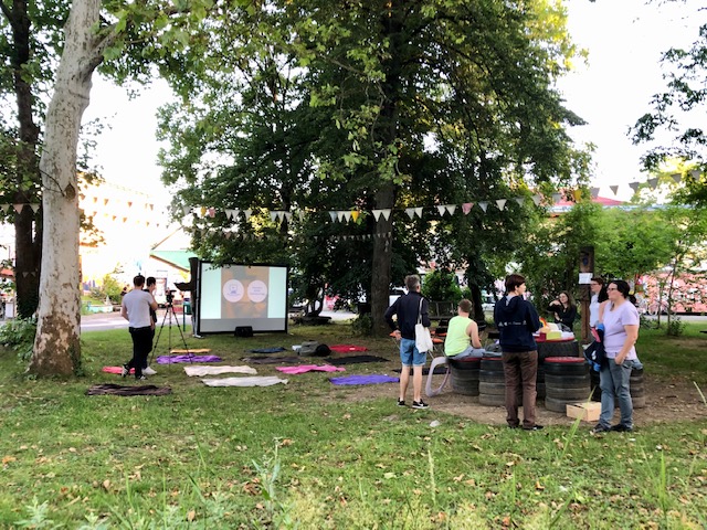 A pak už jsem před půl sedmou dojel k hostelu Pekárna. Je to tu sympatické. Hostel sídlí ve druhém patře domu mládeže. Venku je hned park. Připravuje se večerní letní kino.