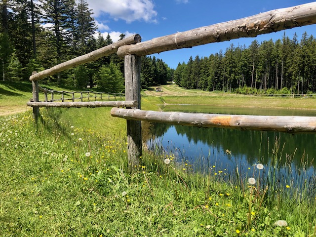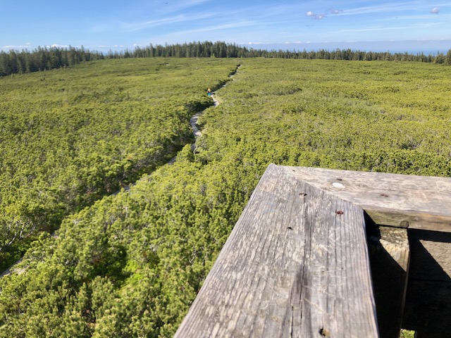 Další chata je vzdálená 10 km. Cesta mě pořád baví, i když už se cítím o poznání unaveněji. Po cestě ještě je taková zajímavá atrakce – Lovrenška jezera. Je tu taková plošina, kde je nízká kleč a pár jezírek. A u toho rozhledna.