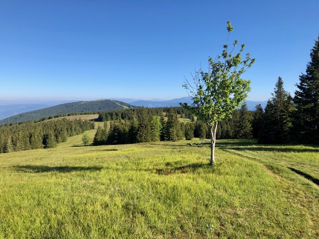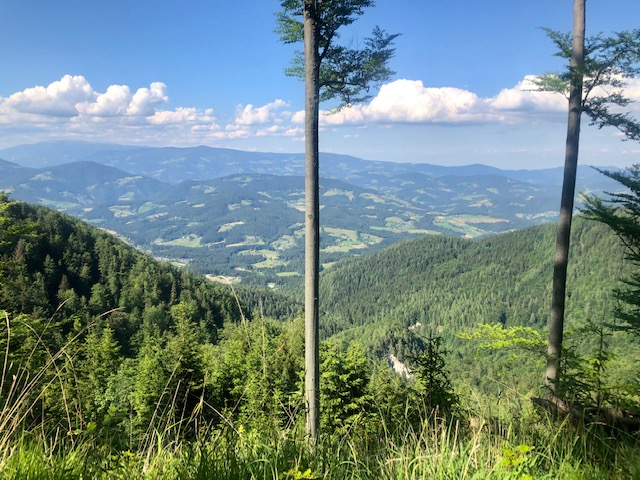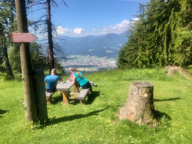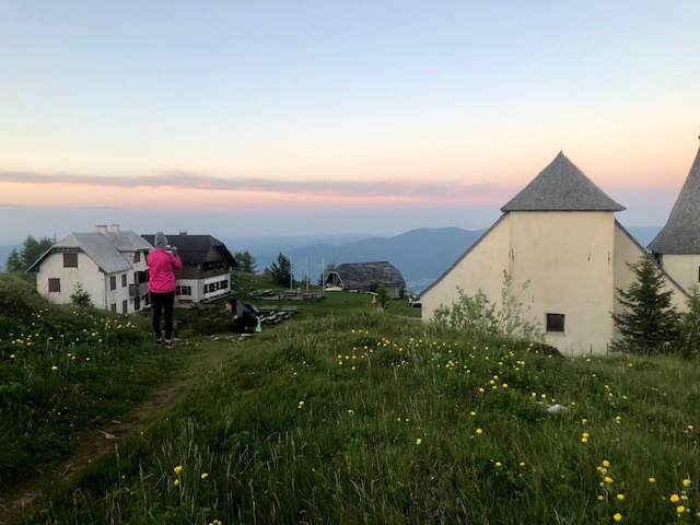 O půl jedenácté přijdu k chatě Koča pod Kremžarjevim vrhom. Dám si štrůdl a pivo. Pak pokračuju dolů. Při klesání, skoro ve městě, potkám pár, co jde natěžko. Tak se chvíli bavíme. Jdou taky tu stezku, ale jen kousek o víkendu a další víkend zas ujdou další kousek.