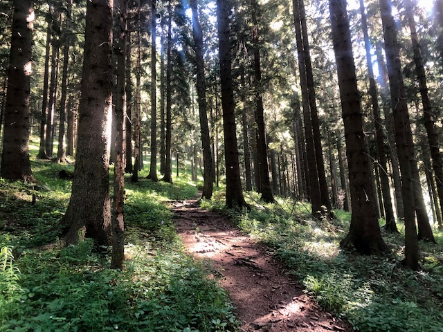 Prve se jde spíš po takové velké lesní cestě, pak se odbočí strmě vzhůru na cestičku a tady to strmě stoupá až do 1600 m. Pak už zbývá jen posledních 5-10 min až k chatě na otevřeném prostoru (do té doby se šlo v lese). Je tu kostel, chata a nahoře na kopci vysílač.
