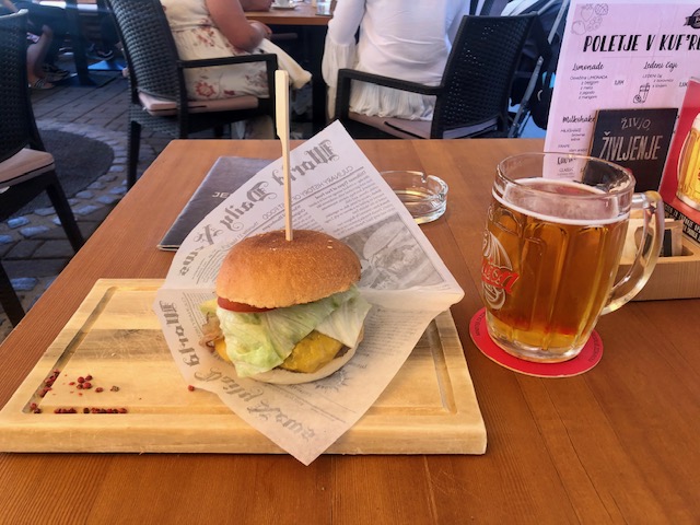 Je hrozný vedro! To člověka někdy dokáže úplně oddělat, když v tom má chodit. Ve městě zakempuju na zahrádce jedné hospody. Dám si burger a zmrzku.