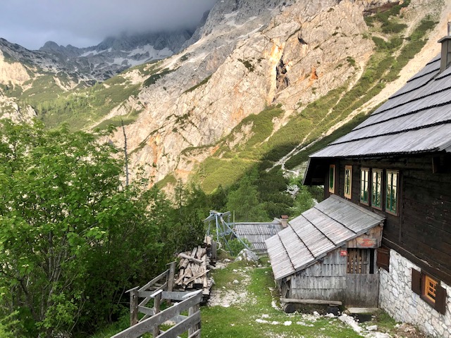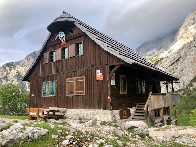 Ve 13:15 dojdu do chaty Kamniška koča (1864 m). Vevnitř je akorát jedna holka, co tu pracuje. Dám si takovou hustou zelňačku (jota) a pivo.