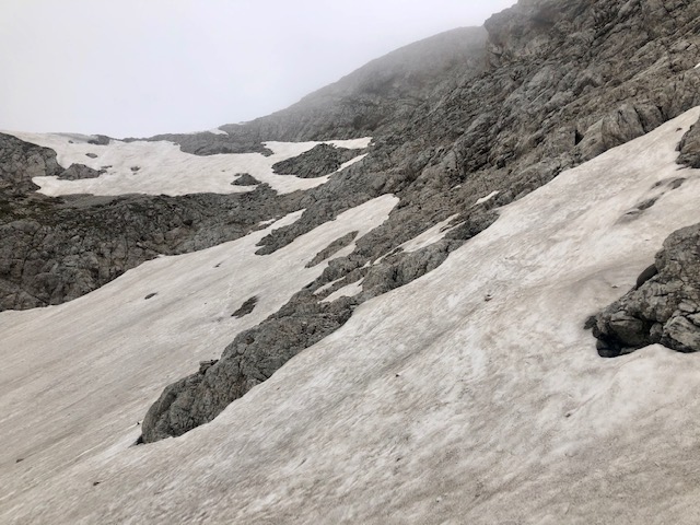 Ale mohl bych ze sedla jít přímo po hřebínku a tam se pak napojit na cestu až za tím sněhem. Jde to, dokonce je tu nějaká stará cestička. Hurá, napojil jsem se. Ale moje radost netrvala moc dlouho. Jsem sotva v 2200, jenže jsou tu další kusy sněhu. A fakt se snažím, ale po chvíli musím kapitulovat. Už by to bylo moc o hubu. A už tak to byl dost adrenalin. Do toho totiž ještě trochu pršelo a začínala mi být celkem zima na prsty.
