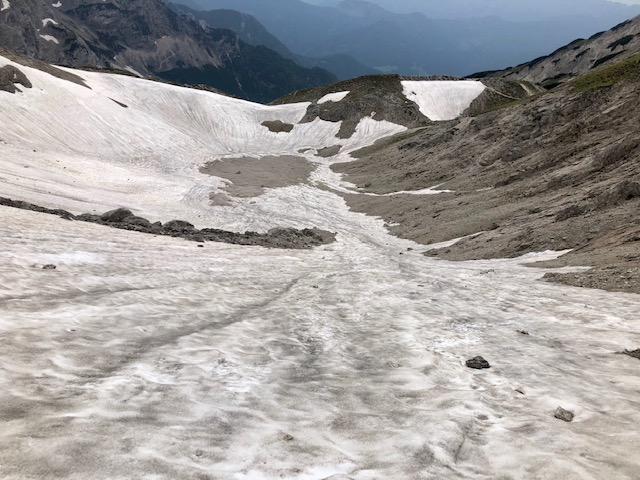 Jsem v sedle, co teď? Buď se dá jít 300 m dolů do chaty. Anebo pokračovat dál až do 2400 m a pak dolů na jih a přespat v jednom takovém hezkém bivaku. To je můj cíl. Jenže hned ze sedla vidím, že brzo bude velké sněhové pole.