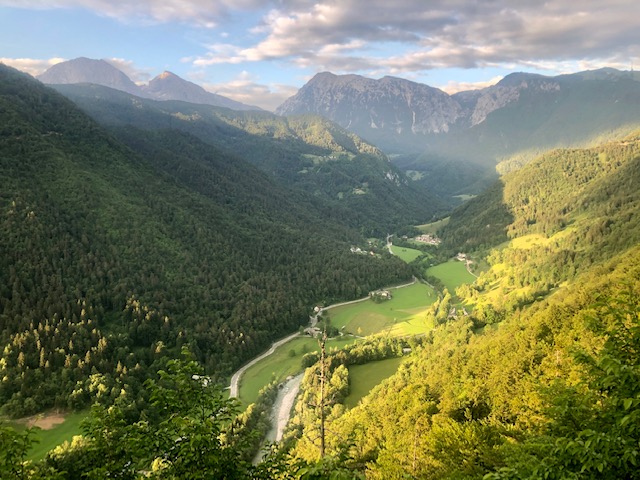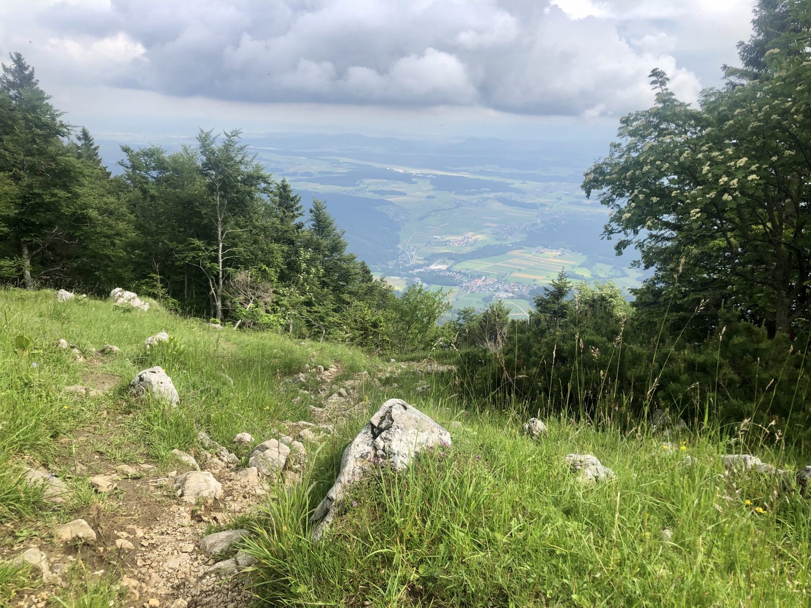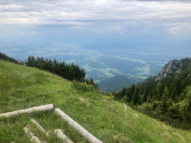 V sedle jsem ve 12:47. Je tu hezký výhled. SPP pokračuje na vrchol Storžič (2100 m), ale já jdu prve kousek na jih do chaty a pak dál dolů do údolí navštívit kamaráda Thomase, kterého jsem potkal minulý rok ve Švýcarsku – tehdy šel ze Slovinska do Chamonix, kde se narodil. Na Storžič se vrátím zítra, akorát trochu jinou cestou.