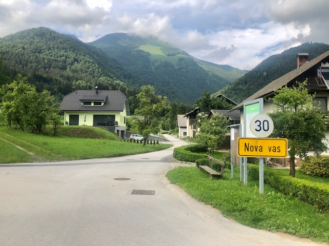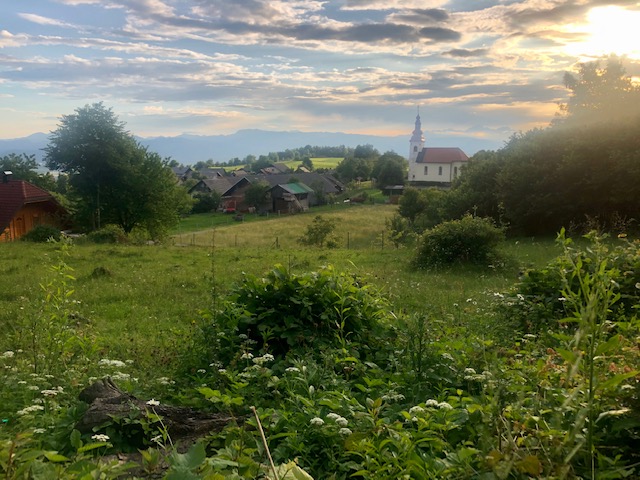 A přesně v 18 hod jsem byl v Možjance (650 m, ale prve jsem musel slézt do 450 m). Měl jsem špatné informace o přesné lokaci, takže to chtělo ještě telefonát a pak už jsme se shledali s Thomasem. Koupil si ve vesnici takovou chatku, která 10 let stála ladem. Zatím nemá elektřinu, ani teplou vodu. Ale má studenou sprchu! Je tu zatím pár týdnů a snad to brzo začne opravovat.