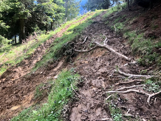 O půl čtvrté vystoupím na poslední vrchol (Rosenkogel, 1176 m) a pak už začíná klesání. Na klesání snad ani nic moc zajímavé nebylo, až na to, že bylo místy dost bahno. Což bylo vlastně i během traverzu, kde to občas bylo dost rozryté od dobytka.
