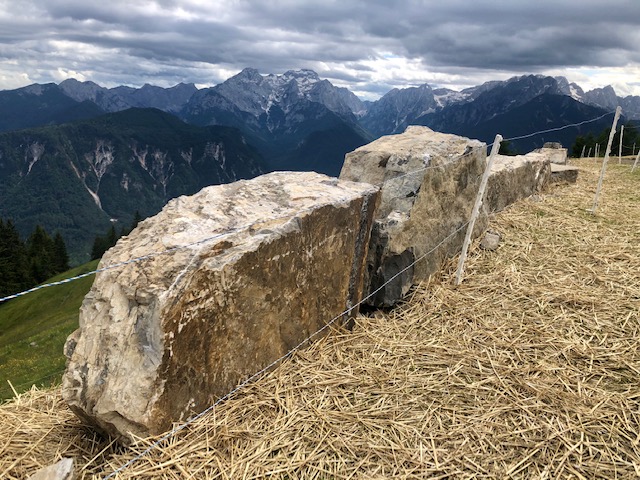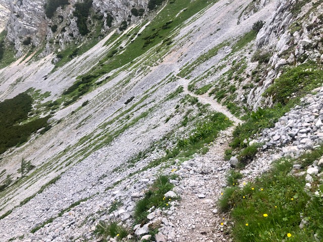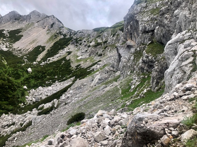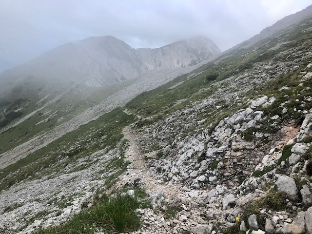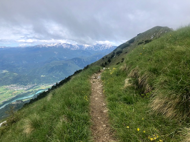 Prve jdu trochu níž a pak začíná takový travers pod hřebenem. Takto je to po zbytek dne. Občas ještě vylezu na vrchol na hřebeni, ale většinou jdu kousek pod hřebenem na jižní straně směrem na západ. Je to dost mírné a je to zábava. Celou dobu mám výhled na Julské alpy a Triglav.