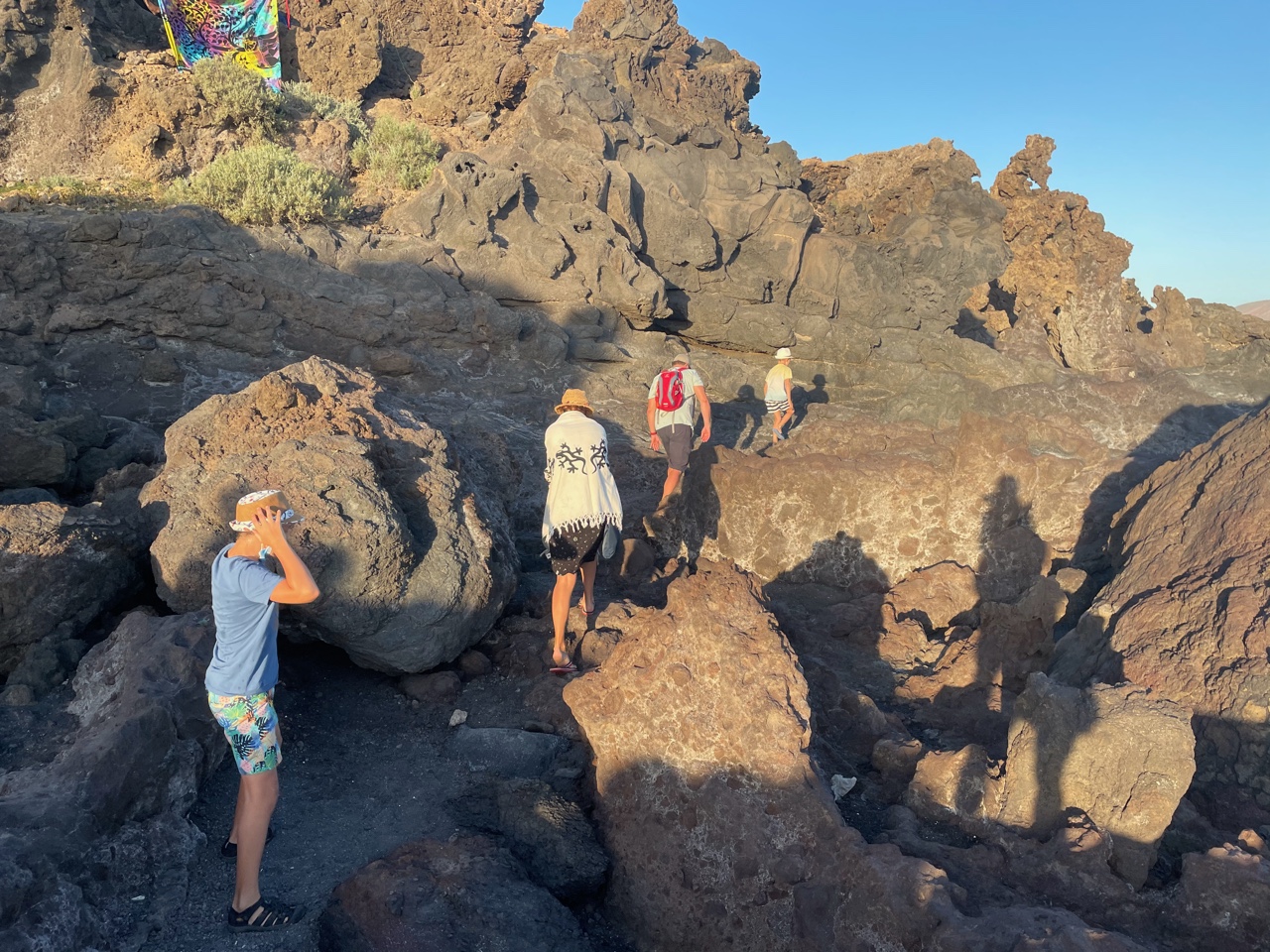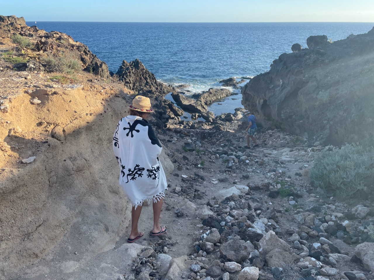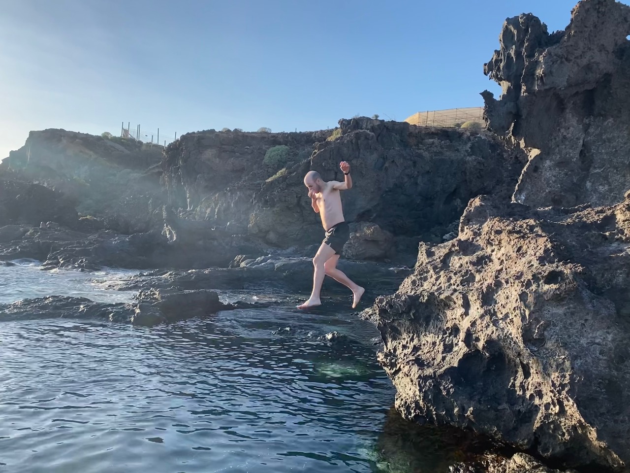 Než zaplatíme, tak je 5 hodin. Jedem autem dom a po cestě se zastavíme na koupání v takovém místě, kde jsou skály a různé jeskyňky, kde přebývají nějací zevláci. Dole u vody je přírodní bazének, kde různě kolísá hladina vody podle aktuálních podmínek. Je to dobrý!
