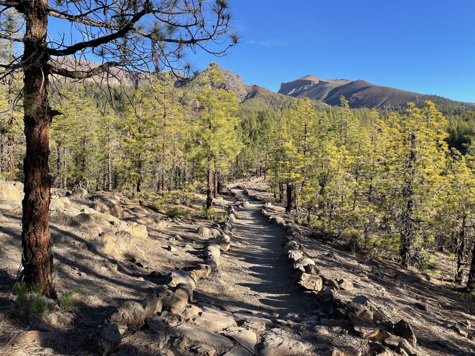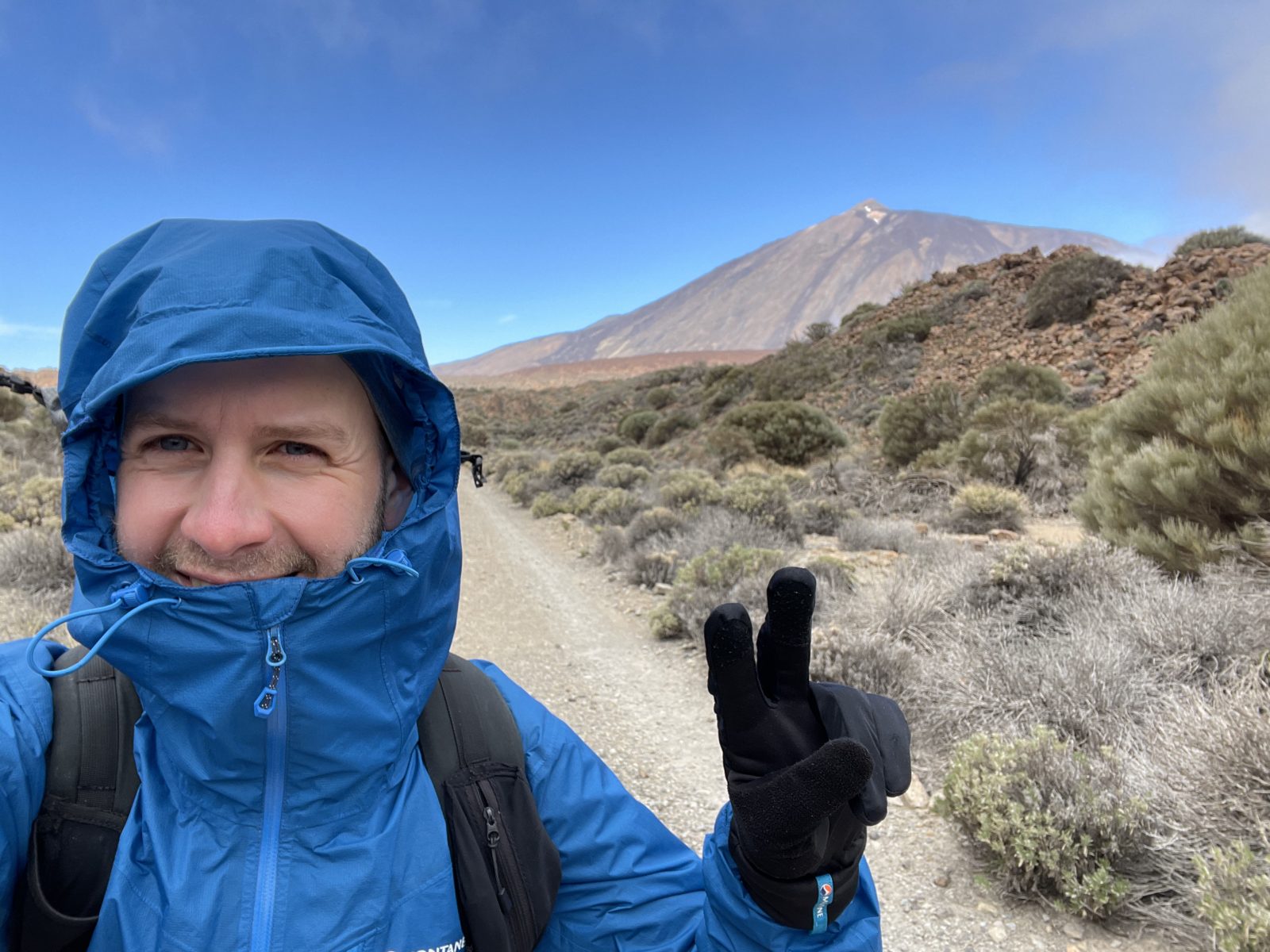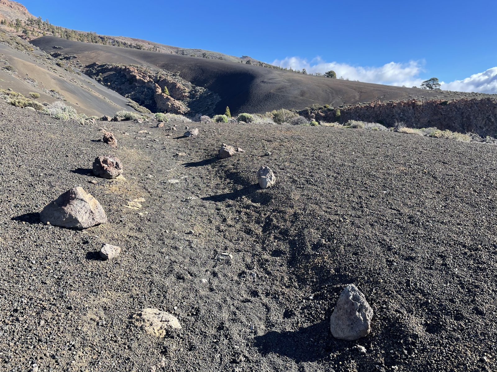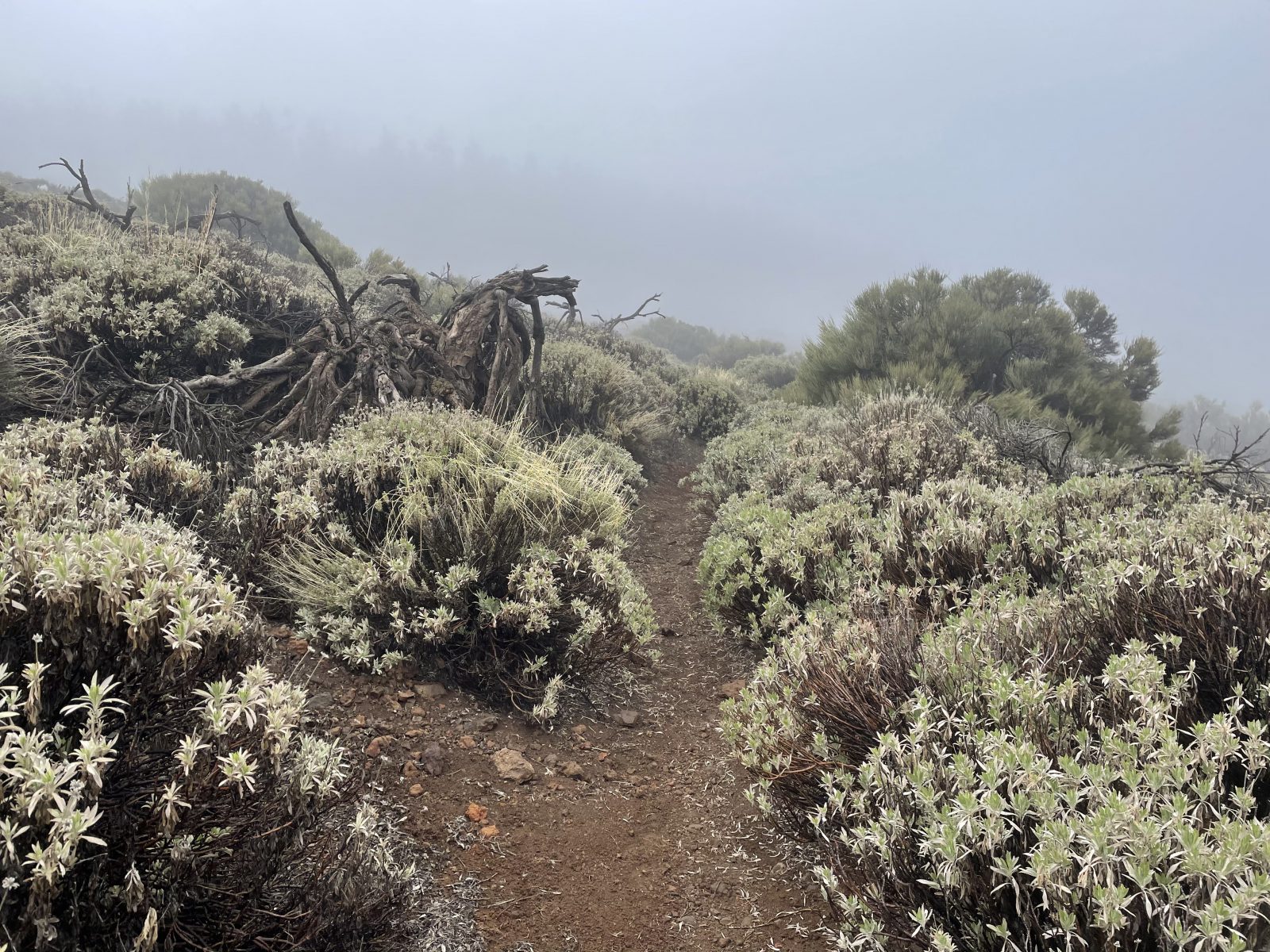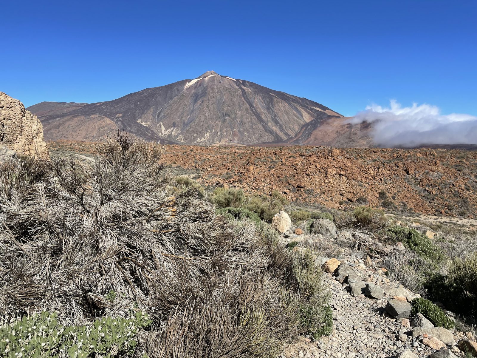 V 10:30 se ocitnu na nejvyšším bodu dnešního výletu – asi 2380 m. Jsem v sedle na pohoří, co ohraničuje kalderu okolo Pico del Teide. Objevují se mraky, ale ještě stihnu krásný výhled na Teide.