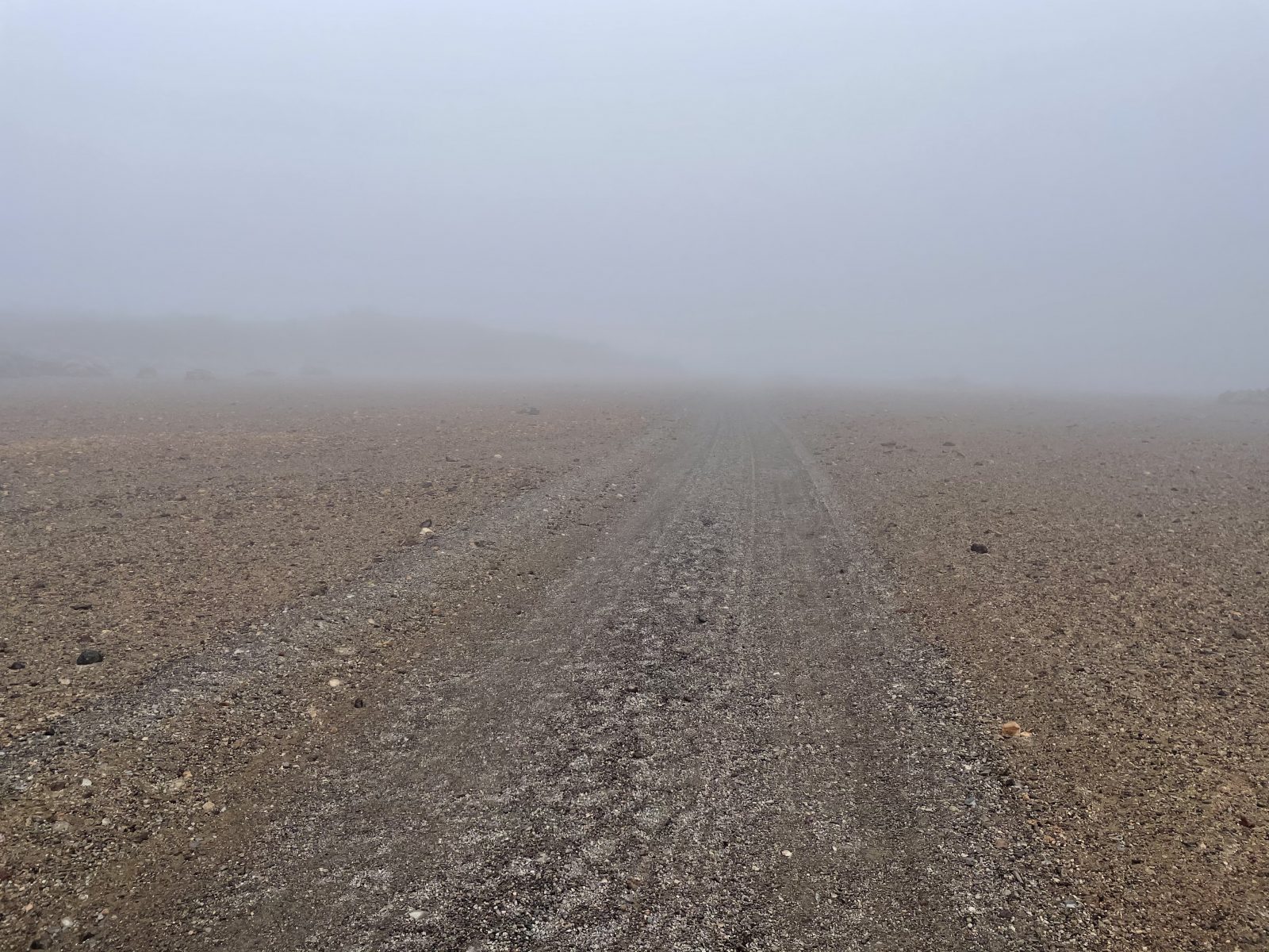Sestoupím o 250 m níž a jsem v kaldeře. Teď mě čeká asi 12 km po štěrkové cestě víceméně po rovině, s jen velmi mírným klesáním. Míjím 3 lidi, kteří jsou navlečení do bund. Cítím se jako hrdina, že jdu v krátkém rukávu, ale moc dlouho mi to nevydrží. Za chvíli mi začne být taková kosa, že zastavuju v závětří a oblíkám na sebe skoro všechno, co mám – dlouhé šusťáky, mikinu, bundu i rukavice. Pokračuju a přidám do tempa, ale i tak se jen tak tak zahřeju. Hrozně fučí, často jsem v mlze a je tu fakt kosa. Trocha toho extrému!