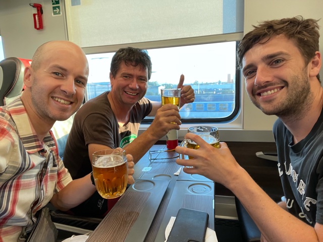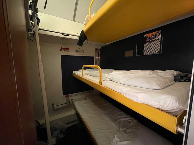 Nastupuju do lůžkového vozu. Průvodčí nás vítá. Budeme tu v kupé 3 – kromě mě ještě mladý Brit Calum, který žije a pracuje v Bernu a do Prahy jel na otočku k zubaři, a pak Honza – čtyřicátník, který jede podobně jako já do hor (konkrétně na týden do okolí Gotthardského průsmyku).