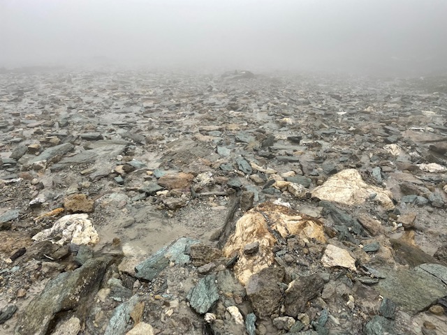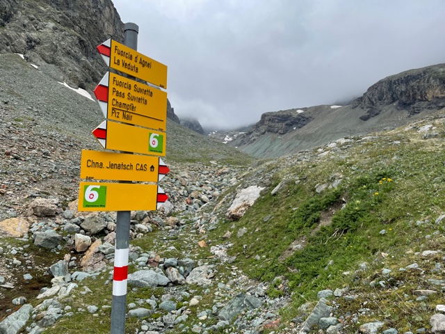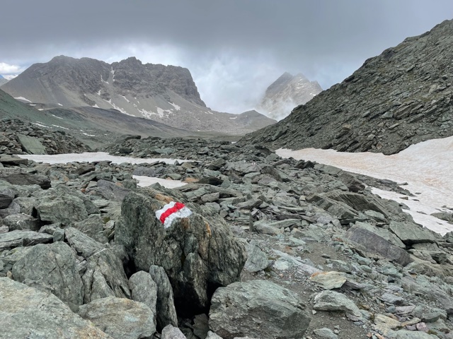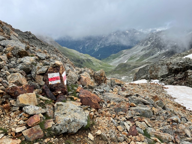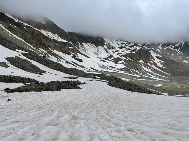 Začínám stoupat do dalšího sedla. Je to už strmější a náročnější terén. Je 13:28 a jsem v sedle Forcla Suvretta (2966 m). Viditelnost se snížila, jsem trochu v mraku. Ale jak začnu scházet dolů, tak se to zlepší. Je tu spousta sněhu. Několikrát to dost urychlí sestup.