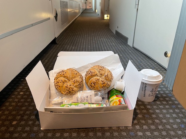 Budík mám nastavený na 7:00. V 6:50 mě budí vlakový budík, který mi nastavil průvodčí. O 5 minut později už klepe na dveře a podává mi krabičku se snídaní a čajem. V Sargansu budeme 7:25, času dost.