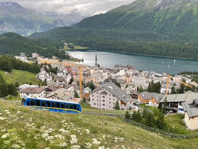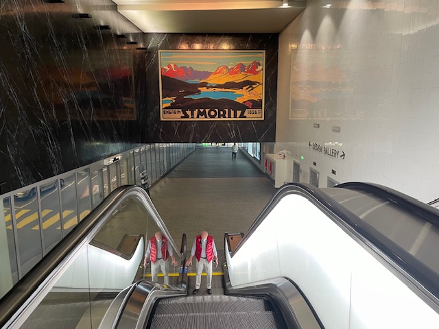 Jsme v cílové stanici – St. Moritz. Chytám na hodinkách GPS a vyrážím. Prve mě cesta vede do parkovacího domu a odtud pokračuje eskalátor do centra městečka.