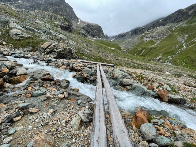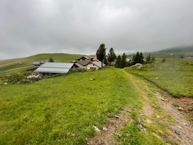 Teď už definitivně vcházím do mlhy. Do toho mrholí. Scházím ze sedla dolů a všude zurčí potoky vod. Je to dost strmé a technické a vidím prd. Chce to dost soustředění. Pak začnou louky a všechno je bahnité a rozdupané od krav. Je to humus.