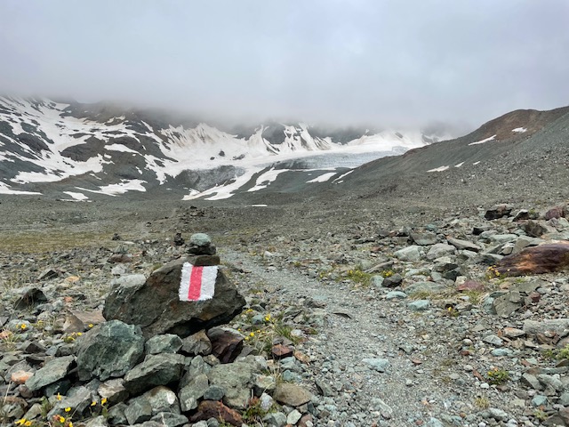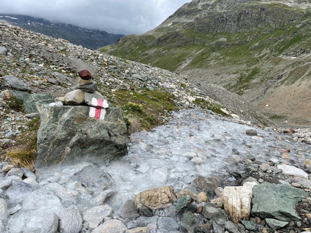 Stezka se mění ze štěrkového chodníku na úzkou kamenitou cestičku. Začíná sutoviště. Objevují se sněhová pole.