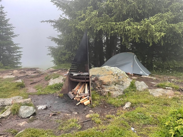 Nakonec ruším hotel a po chvíli sestupu odbočuju na štěrkovou cestu a doufám, že to nekde půjde. Po chvíli najdu místo hned u cesty, kde by to snad šlo. Ale raději bych něco víc skrytého. Nakonec se doplahočím zase o 200 m výš k jezírku. Na mapě je vyznačené místo na bbq. Skutečně tu je rošt a dřevo. Vedle je pár stromů. Šlo by to pod nima? Není to podmáčené a je to hodně hrbolaté, ale asi už nic lepšího nenajdu. Beru to. Ale fakt je dost problém si tam nějak pohodlně lehnout.