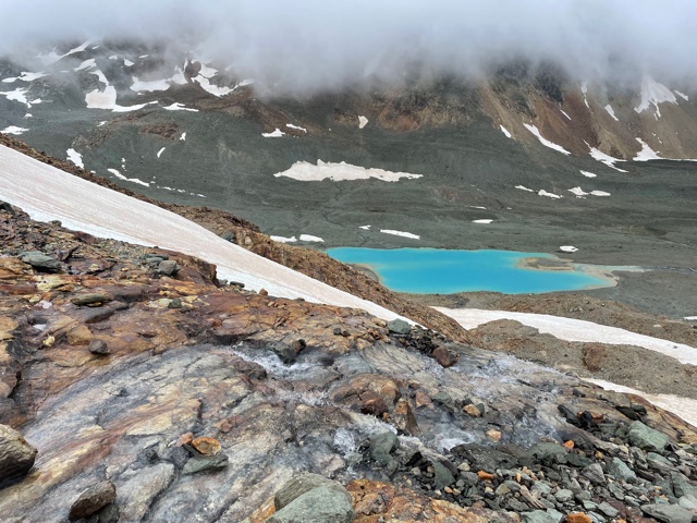 Vracím se zpět na rozcestí a zase stoupám vzhůru. Je to spektakulární. Je tu ledovec a pod ním jezírko s krásnou modrou vodou. Všude spousta vody. A pak skalky a sněhová pole. Makám!