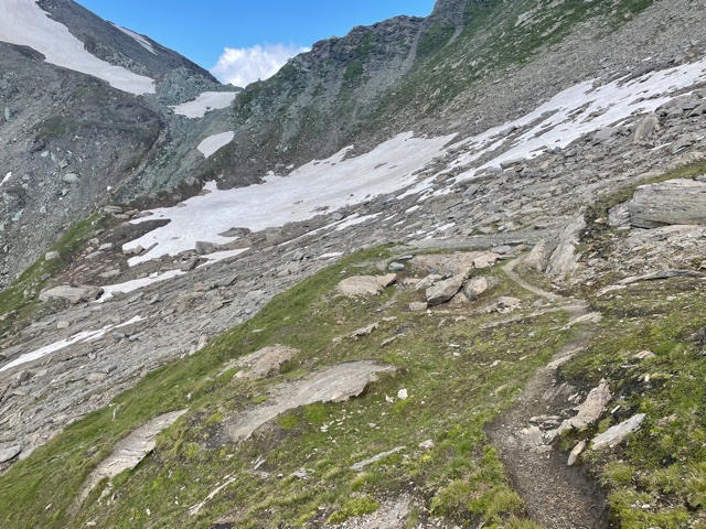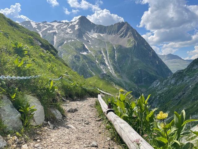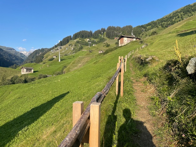 Něco pojím, balím a v 7:24 vyrážím. Začátek je brutální, jakože strmej. Pak jdu chvíli po zpevněné cestě, tak to je trochu mírnější. Ráno chvilku jela lanovka, až jsem se divil, že tak brzo, ale pak zastavila. Možná vezli personál?