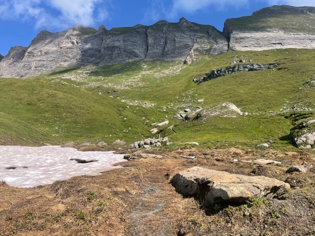 Jelikož jsem měl pauzu nedávno, tak se jen minutu kochám a pak vyrazím dolů. Začátek je náročnej. Je to suťovisko a trochu ho traverzuju, ale stezka není moc žretelná. Ještě že je jasno a značky jsou vidět.