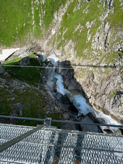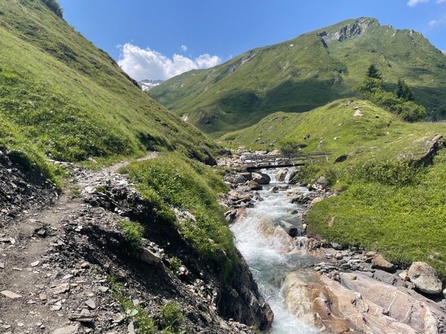 Přejdu most a pak je tu ještě taková stezka nad řekou, která je hluboko pode mnou. Před 4. jsem na chatě. U stolů před chatou je živo. Je to zřejmě oblíbená destinace. Ptám se na nocleh. Chvilka napětí, paní studuje plánek, jak jsou obsazení a kam by mě mohla dát a… půjde to! Polopenze stojí 85. Mám alpenverein, tak jen 74, jaká láce!