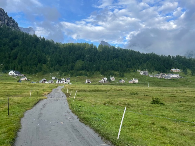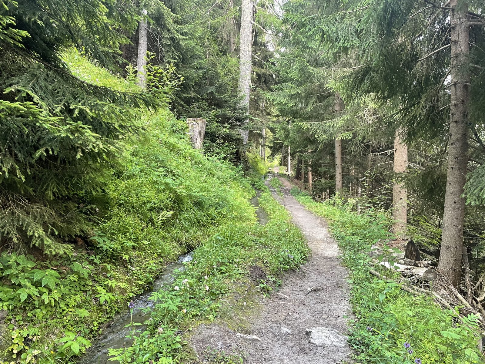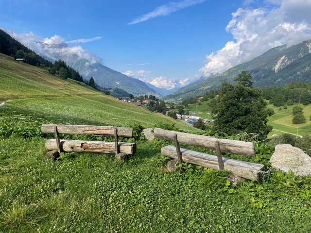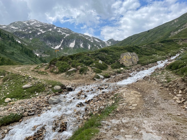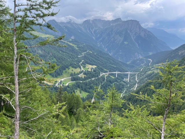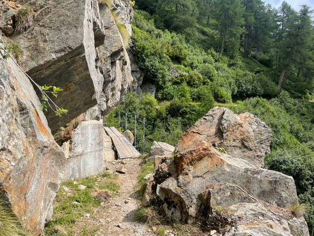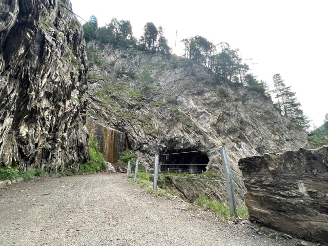 Pak dojdu po silnici až k tunelu. Údolí se jmenuje Binntal a tunel vede do vesnice Binn. Prý než postavili tunel, tak lidé v zimě často byli týdny izolovaní. Po staré cestě teď vede stezka a je celkem populární. Je tu celkem dost lidí. Cesta vede nad hlubokou roklí s řekou.