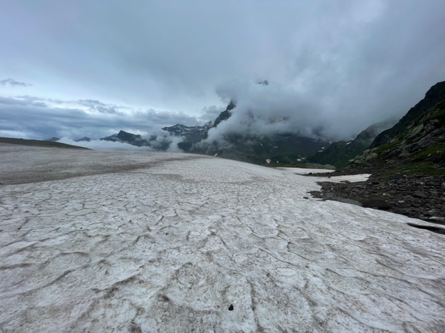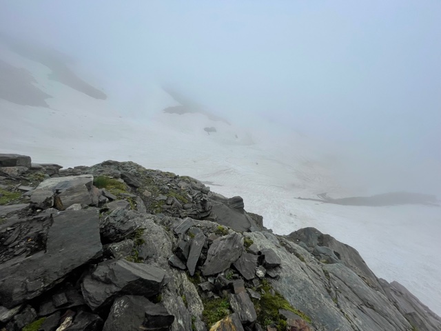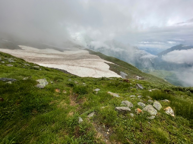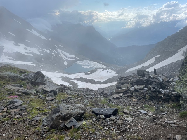 V 18 hod jsem v sedle (2750 m). Pohled na druhou stranu do Itálie mě moc nepotěší. Absolutní mlíko. To bude zajímavé. Začíná to pěkně zhurta. I nějaké kramle a lano. Pak se dostanu na sněhové pole. Naštěstí se s pomocí GPS daří držet správný směr.