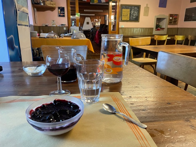 Na jídlo si dám ravioli. A pak červené víno. A pak ještě dostanu dezert z ricotty. Různě řeším kancelářskou činnost. Studuju mapu. Volám s našima.