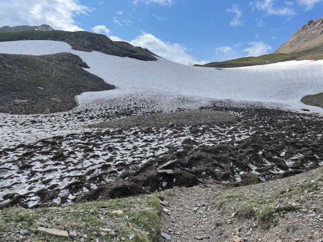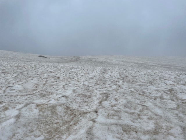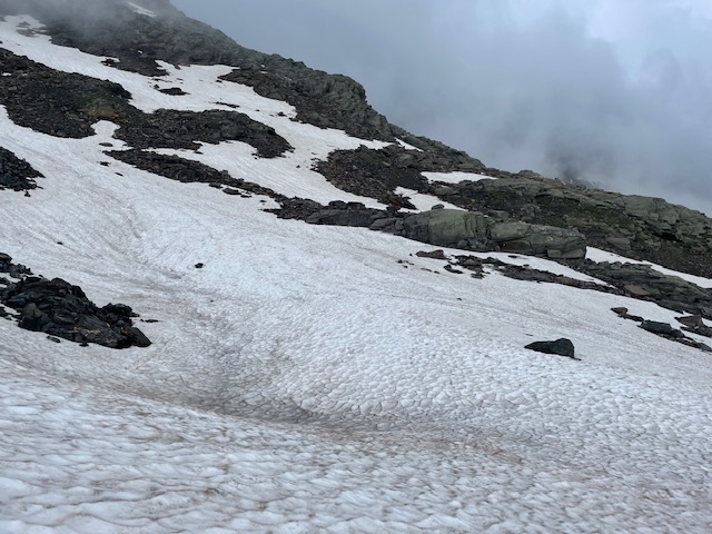 Rozhoduju se, že jdu do toho. Asi 16:50 vyrážím od chaty vzhůru. Jde mi to dobře. Bude to ještě 650 m stoupání. Ve vyšších polohách jsou občas sněhová pole, ale je celkem jasné, kudy jít.