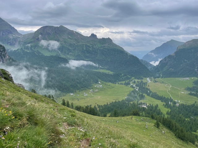 V sedle Saflischpass (2563 m) jsem ve 14 hod. Teď bych měl klesat nějakých 700 m až do Rosswaldu. Ale po asi 450 m volím zkratku a odbočuju prudce doleva. Brzo se zase napojím na stezku č. 6.