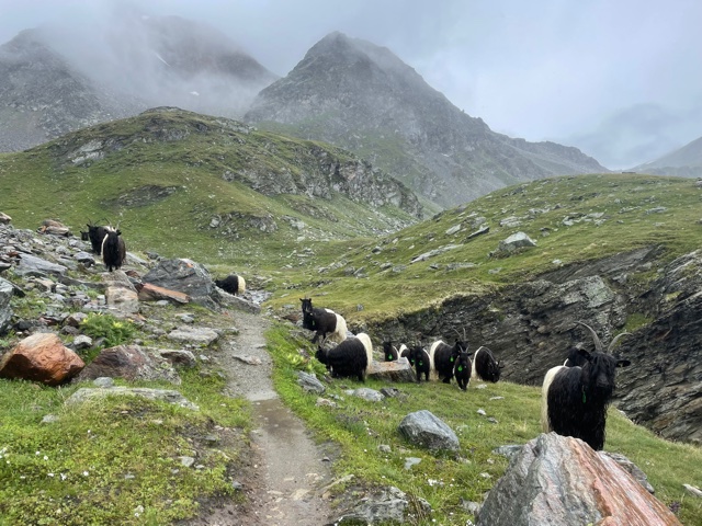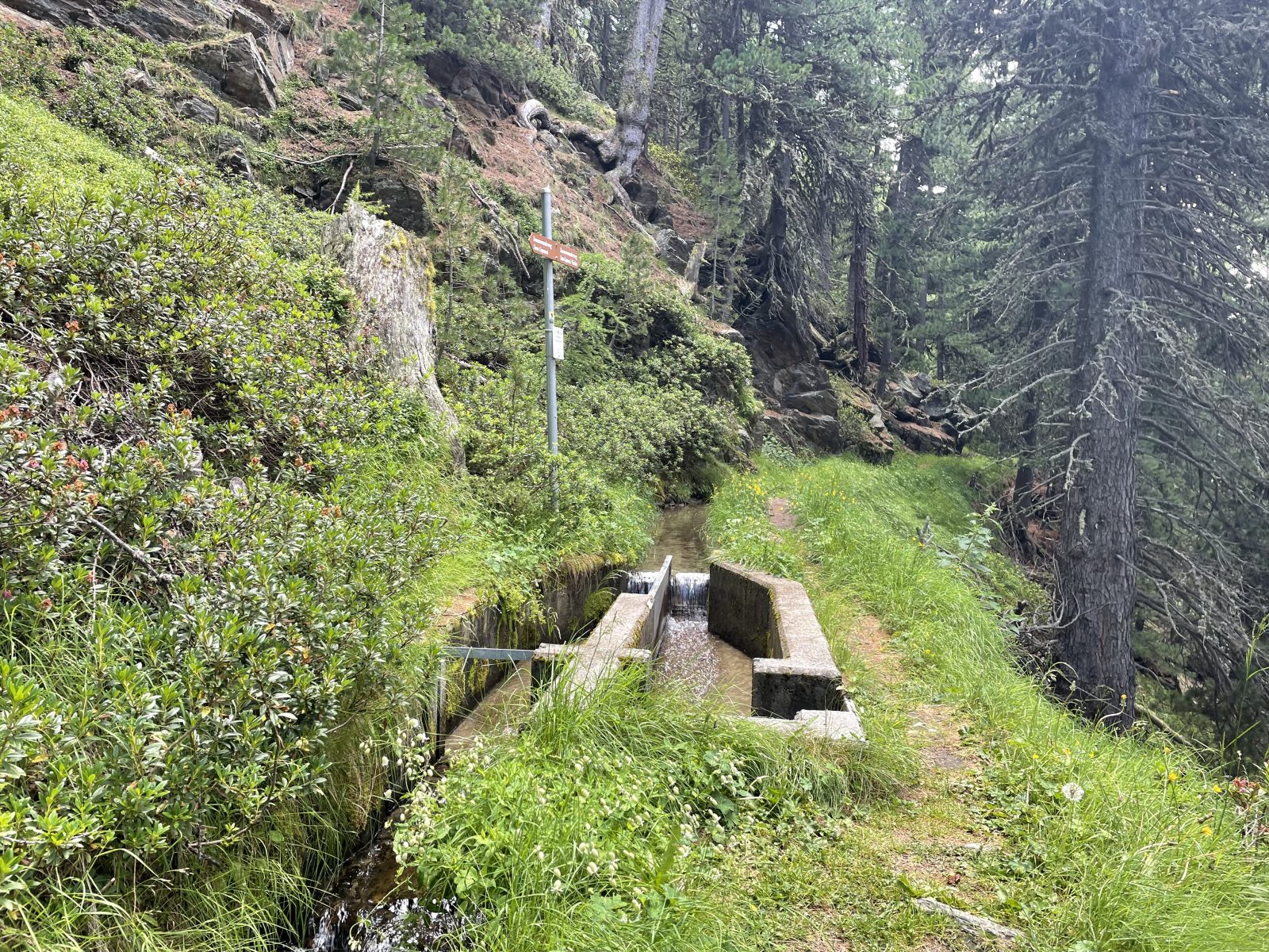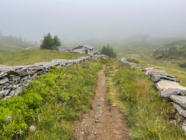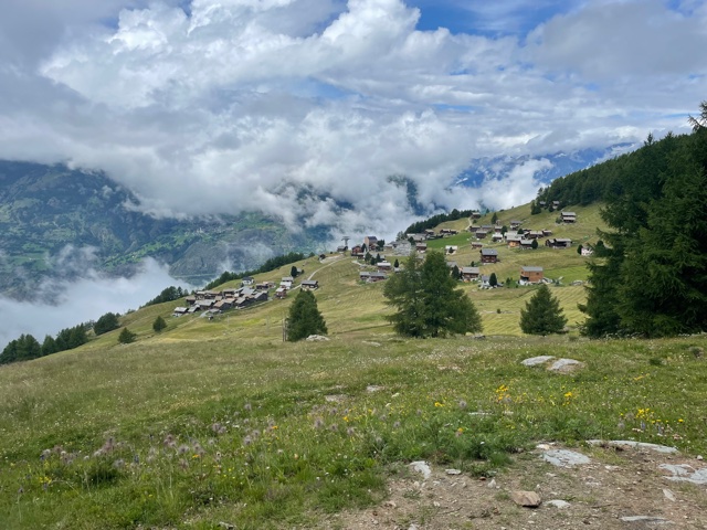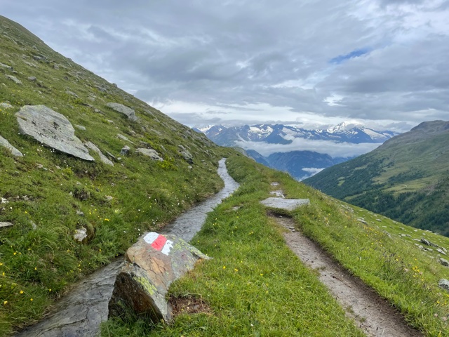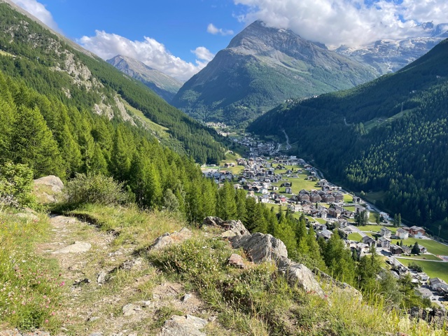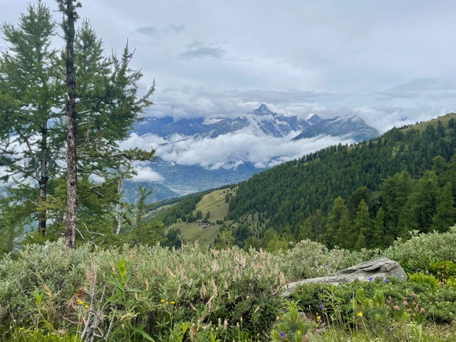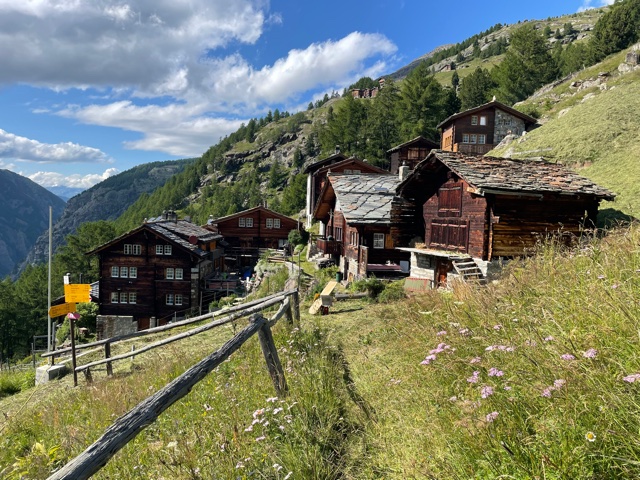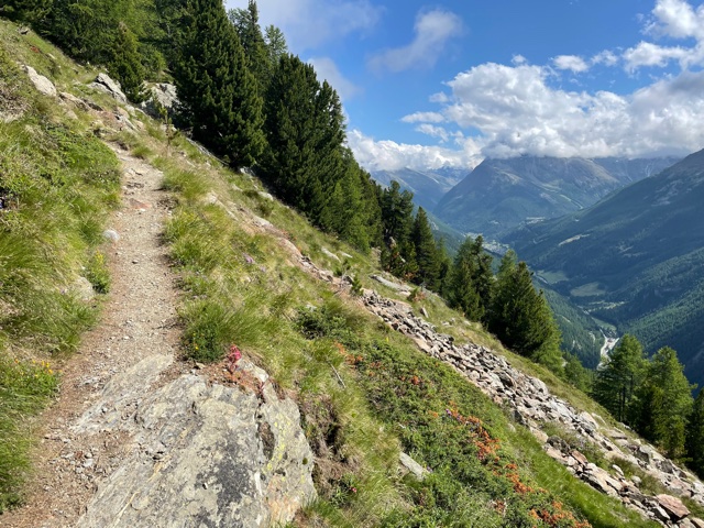 Zhruba v poledne už se dostanu nad údolí Saas – v něm dnes skončím. Jdu po Gspon hohenweg. Je to opět hezká cestička nás údolím, mírně nahoru a dolů, a dokonce začlo svítit slunko! Bomba! Konečně jsem se rozehřál!