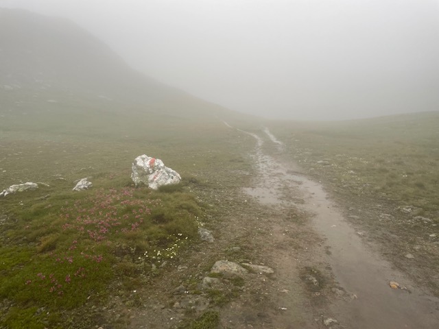 Prve jdu asi 2 mírně z kopce a pak začíná souvislý, ale ne moc prudký kopec. Nastoupám asi 400-500 m. Počasí se horší. Začne pořádně pršet a do toho foukat.