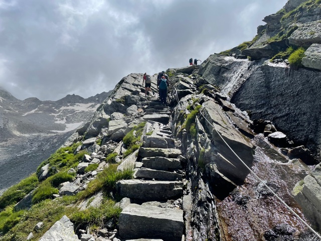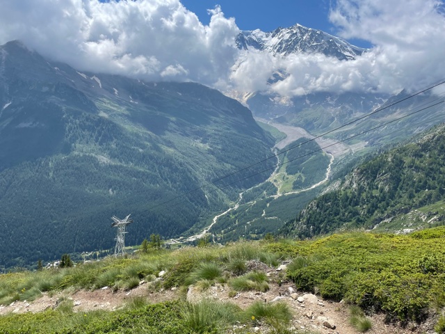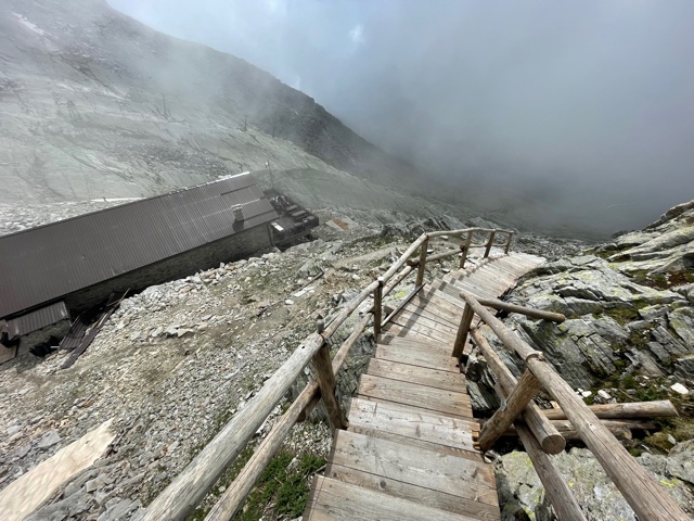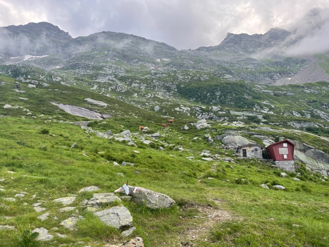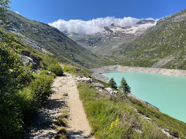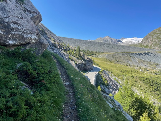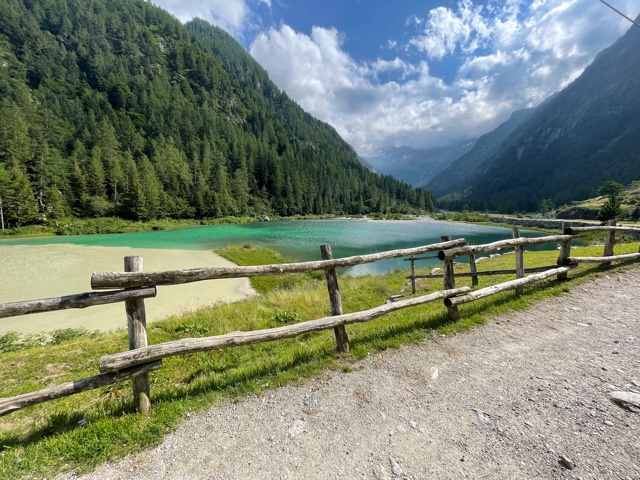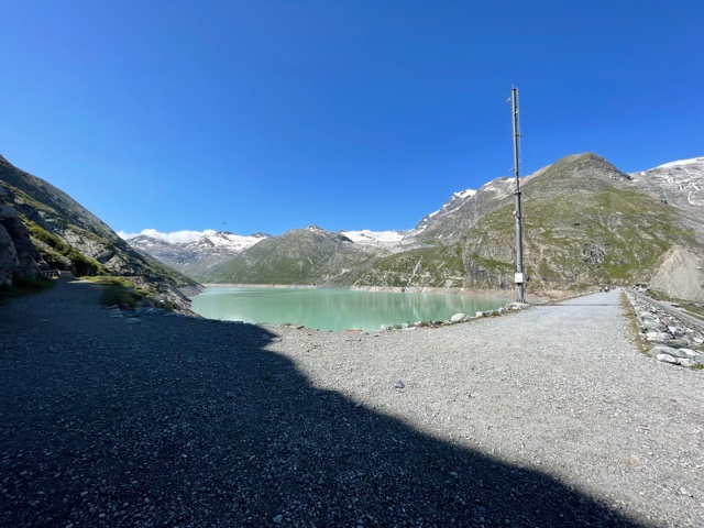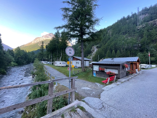 Vstávám asi v 7:18, balím, snídám a v 8:23 vyrážím. Prve půjdu podél řeky proti proudu, až dojdu do další a poslední vesnice v údolí – Saas-Almagell. Tam se napojím na Tour Monte Rosa (TMR) a budu pokračovat dál na konec údolí. Prve podél silnice, pak nad ni vystoupám, až dojdu na okraj přehrady Stausee Mattmark ve výšce 2150 m. Tím mám už asi 650 m stoupání za sebou, hurá!