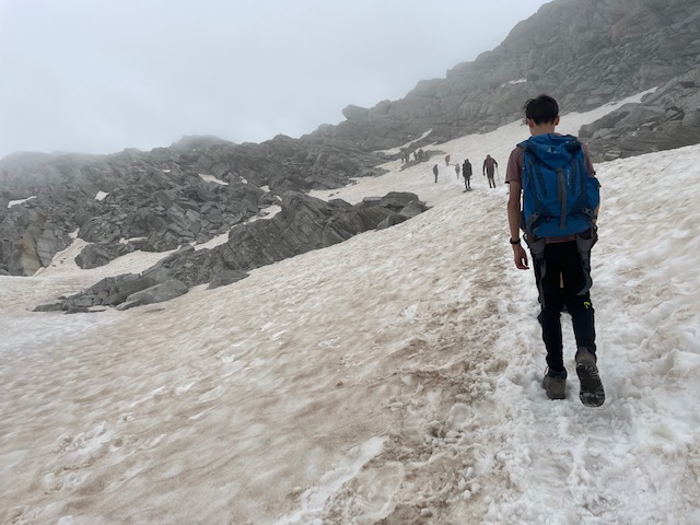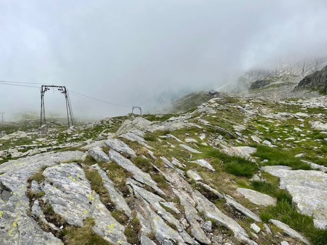 Je tu v sedle hodně lidí a taky mraky, ale občas se nám otevře výhled. Fotíme spoustu fotek, pak se loučíme a já pokračuju na druhou stranu do Itálie (yes!).