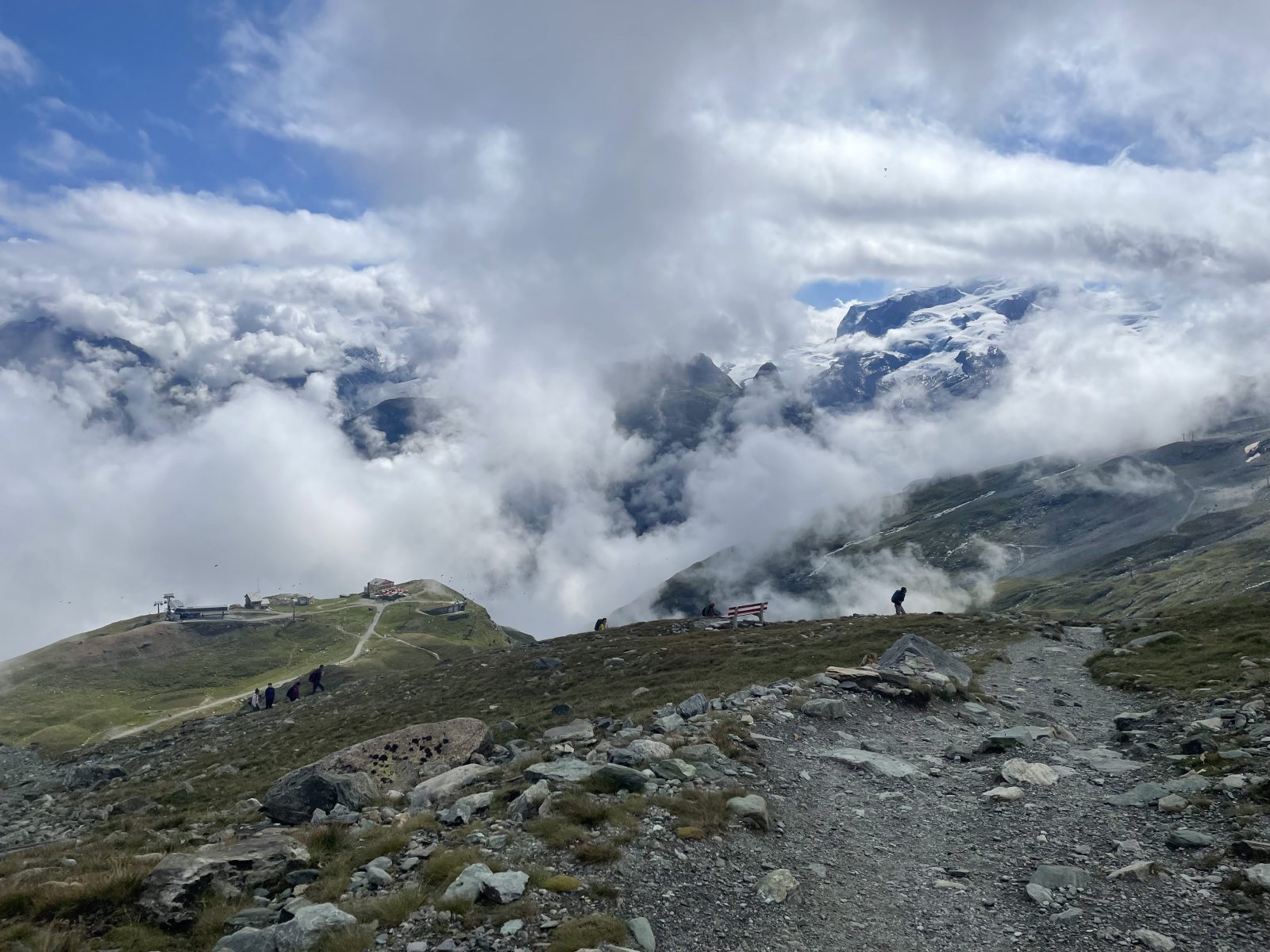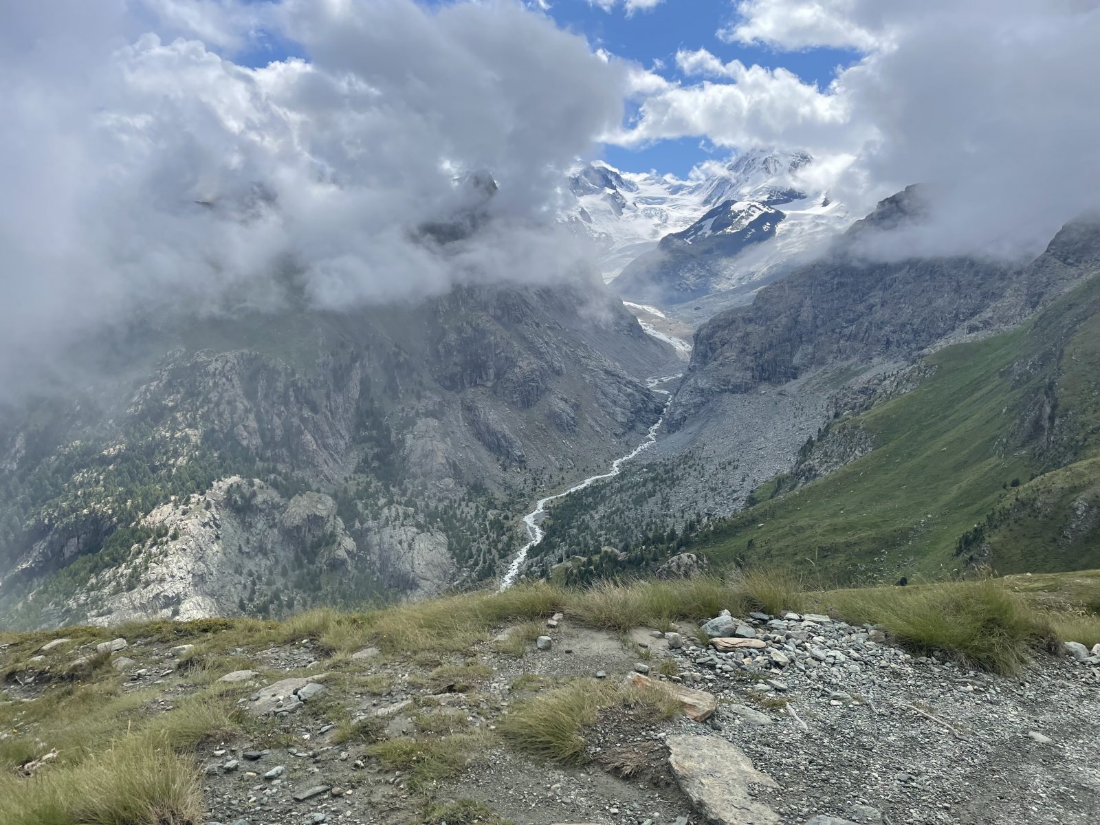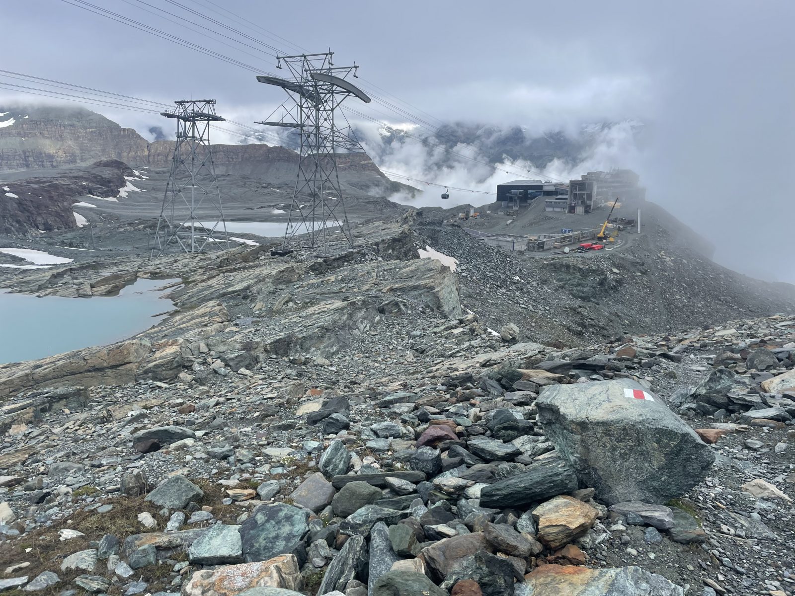 V 8:40 dojdu ke stanici lanovky asi ve výšce 2900 m. Tady mám na výběr – buď půjdu přímo dolů, anebo ještě trochu oklikou po naučné stezce blízko ledovce. Volím druhou možnost. Je to zase taková měsíční krajina. Mraky se různě válejí a jednou tak napůl vidím Matterhorn.
