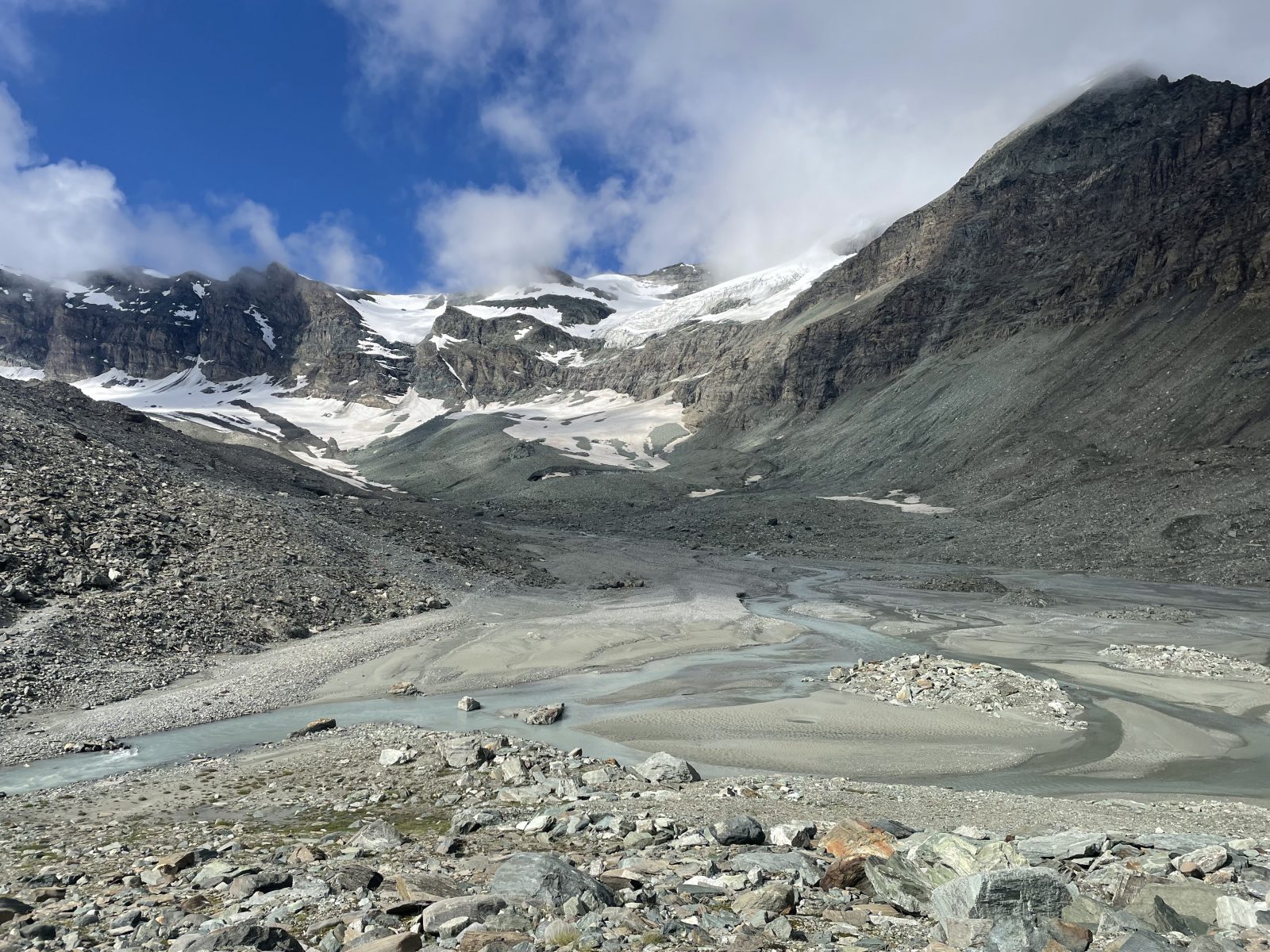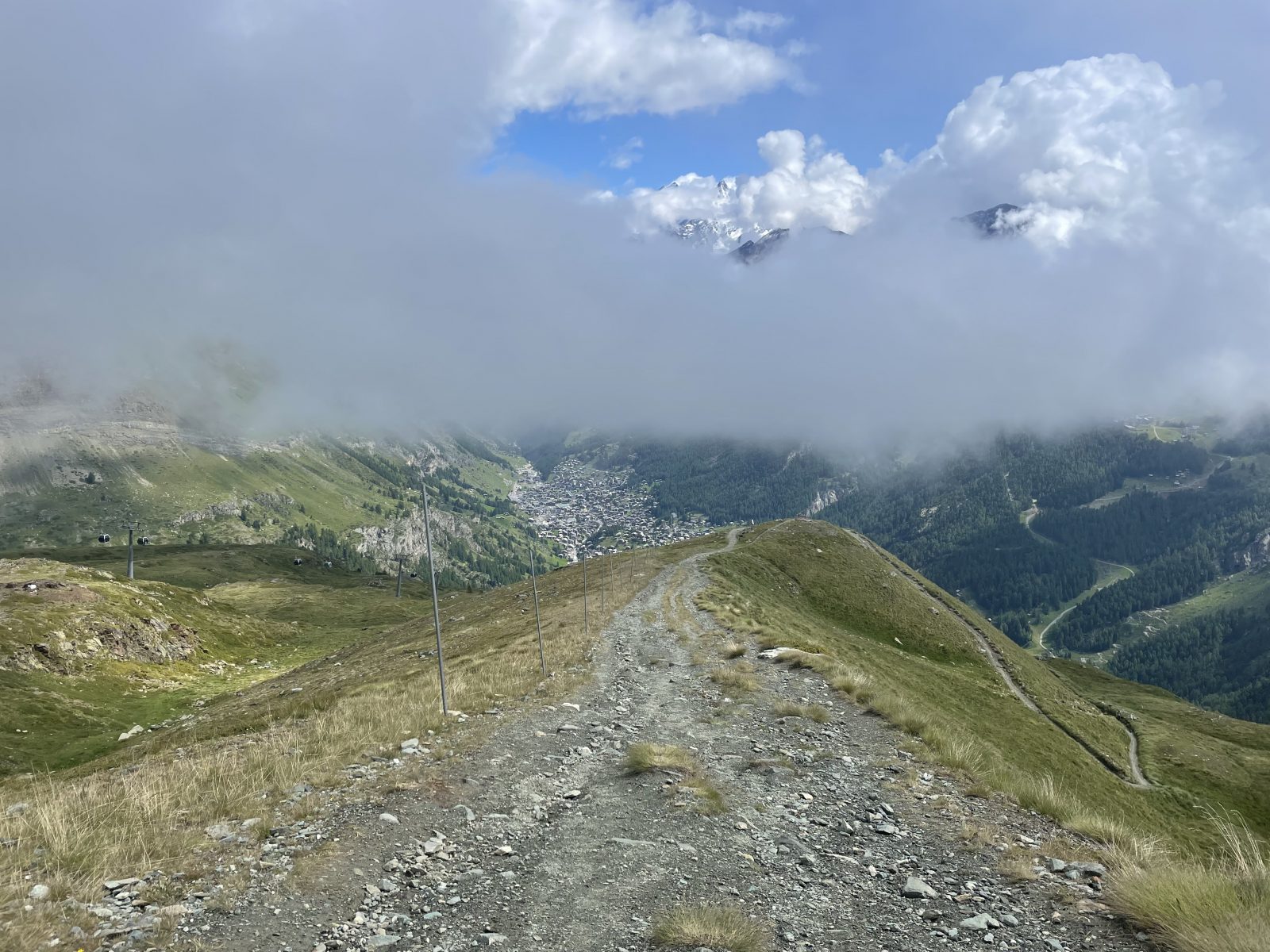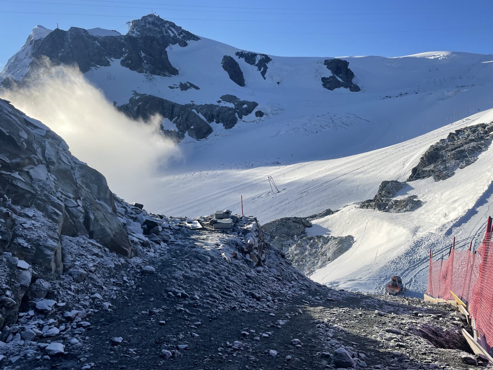 V 8:40 dojdu ke stanici lanovky asi ve výšce 2900 m. Tady mám na výběr – buď půjdu přímo dolů, anebo ještě trochu oklikou po naučné stezce blízko ledovce. Volím druhou možnost. Je to zase taková měsíční krajina. Mraky se různě válejí a jednou tak napůl vidím Matterhorn.
