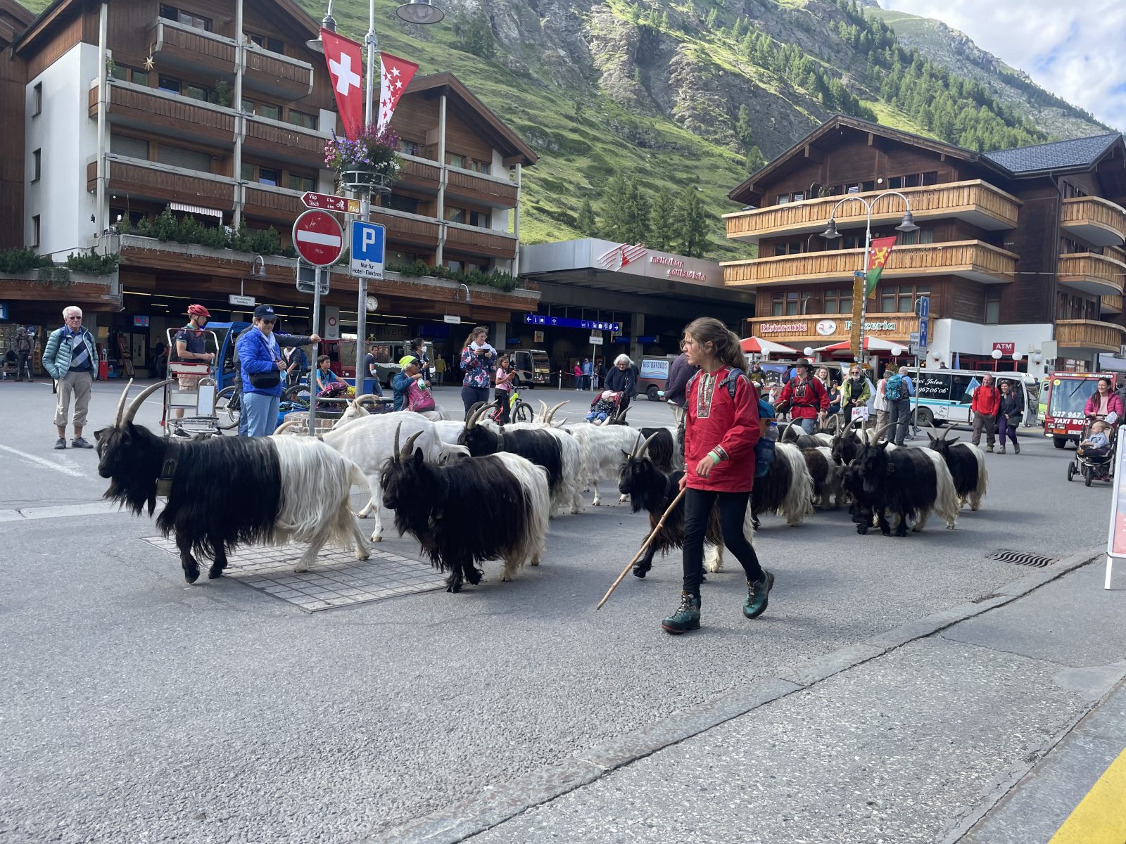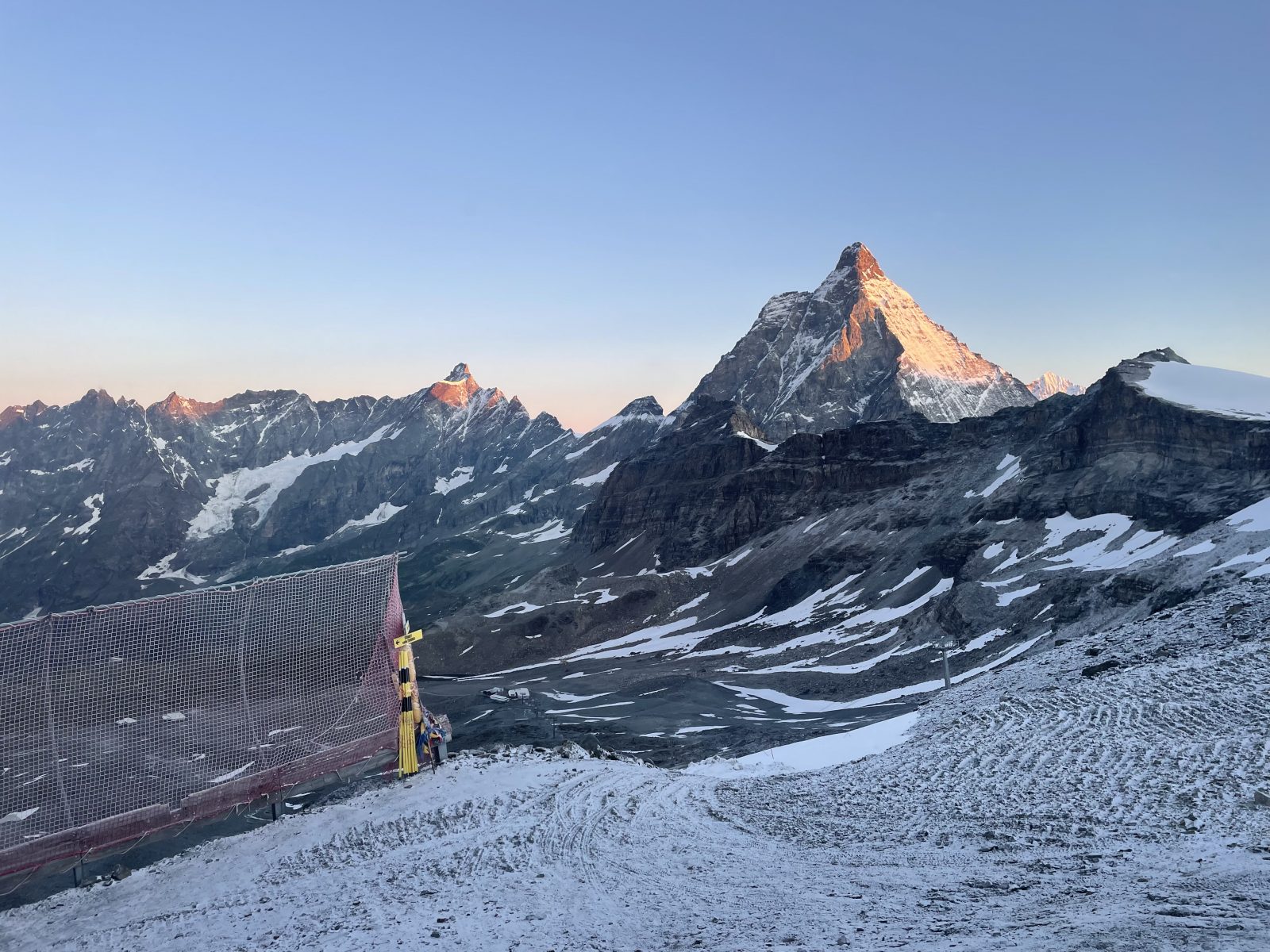 Dvě holky, co se mnou spí na pokoji, vstávají dost brzo, já mám klasicky budíček na 6:45. Ale nějak se mi už nechce ležet, tak vstanu někdy po šesté. Přesněji v 6:13 fotím výhledy z oken. Je jasno, wow! Je tu krásný pohled na Matterhorn.