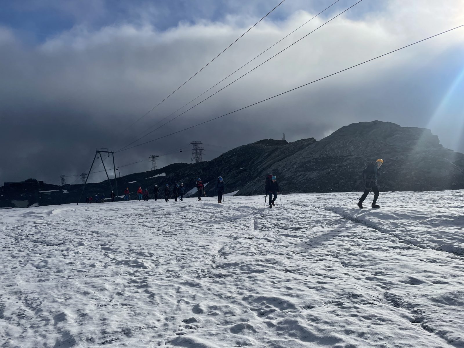 Když takto traverzuju, tak zrovna jde zdola celkem velká skupina lidí, tak 15 jich je. Všichni mají mačky a cepín a jsou navázaní na lano. Já v teniskách a v kraťasech působím trochu jako exot asi. Několik z nich se mě ptá, kusy na Teodul Pass.