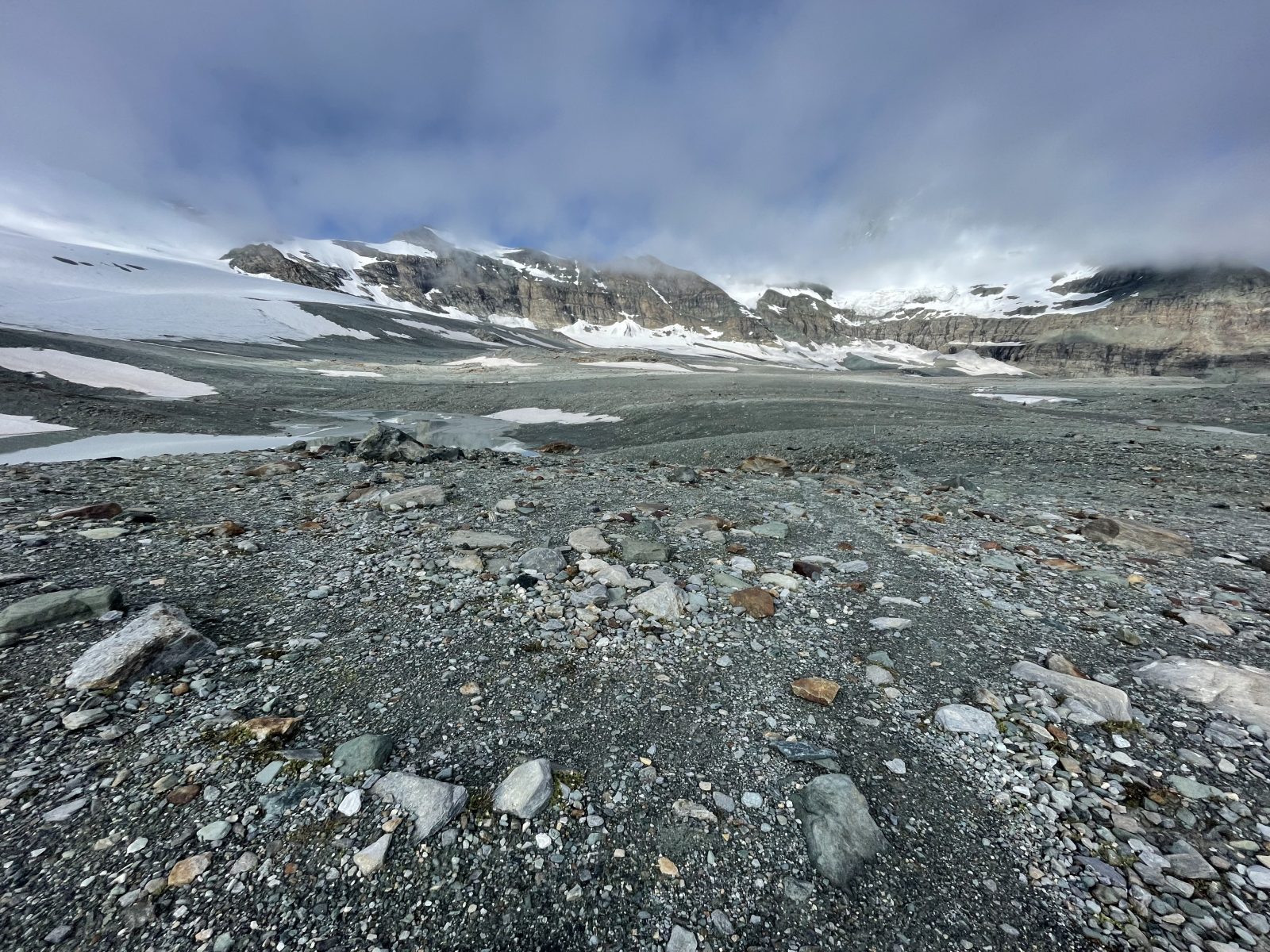 Přejdu na skálu a tady už jsem v bezpečí. Abych to vysvětlil. Samozřejmě to není úplně košer chodit po ledovci bez jištění a v teniskách. Riziko trhliny tu vždy nějaké je. Ale chodí tu bez jištění docela hodně lidí a jsou tu urolbované sjezdovky a včera jsem odpoledne viděl dokonce dva lidi to sjíždět na kole, takže to snad je celkem Ok.