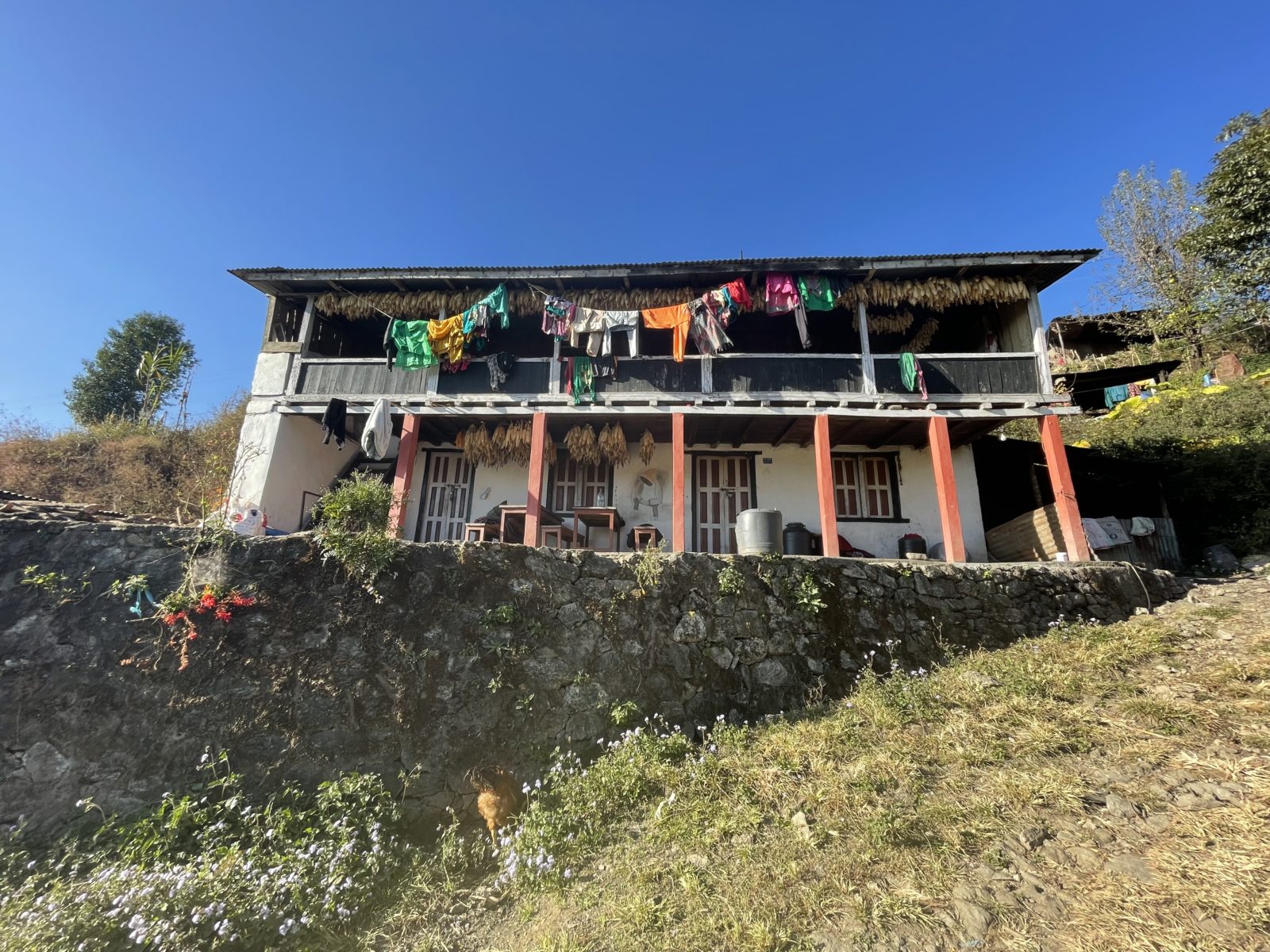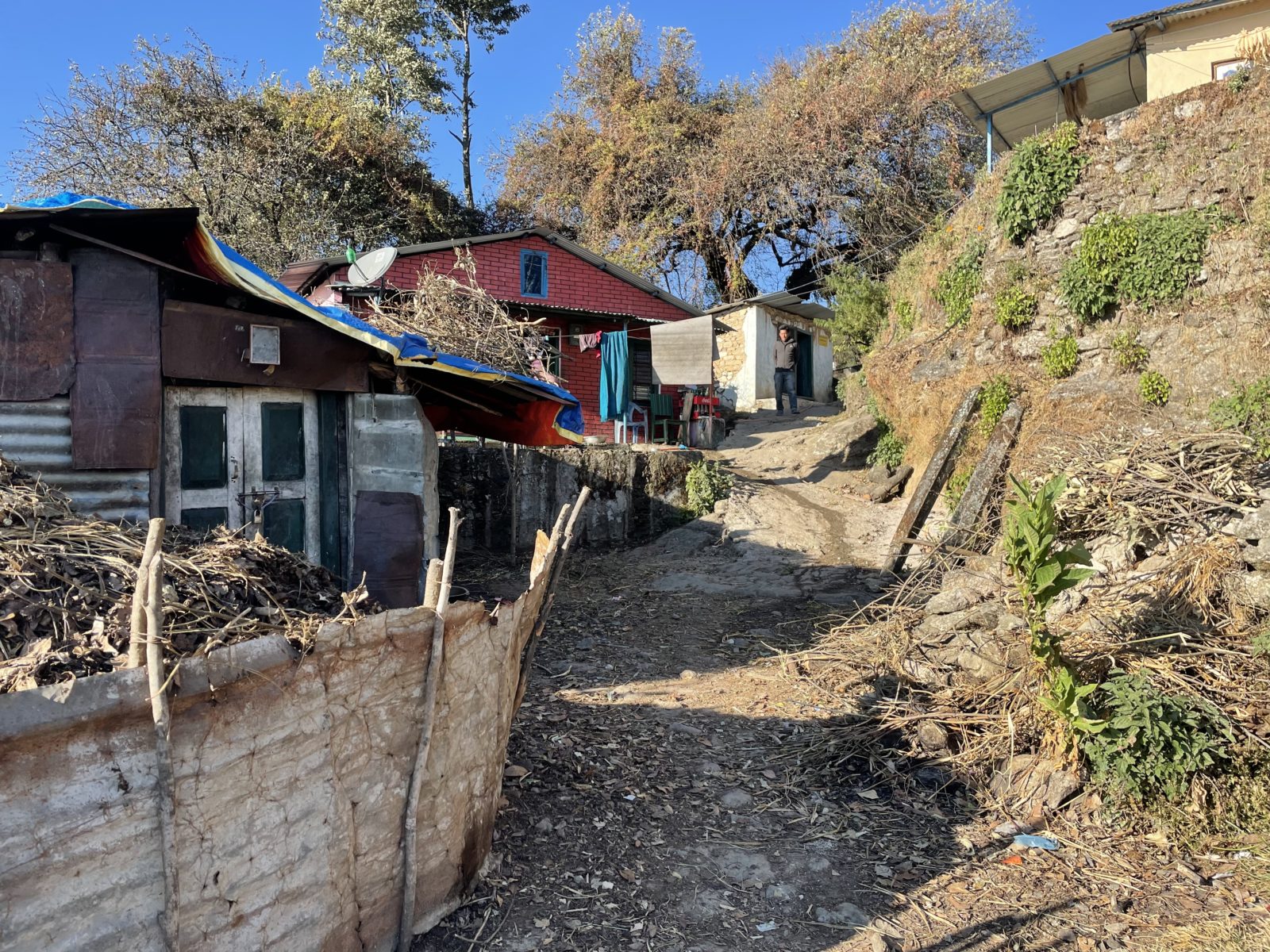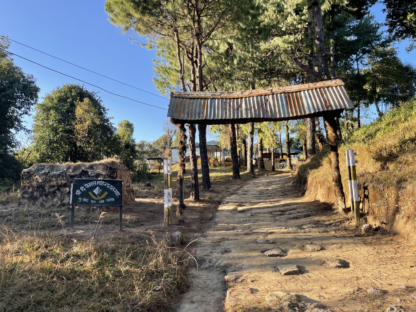 Dojdeme do vesnice Mulkharka a loučíme se. Jsem asi ve výšce 1650 m. Tady les končí a ve stráni se rozprostírají políčka a mezi nima jsou rozeseté domy. Stoupám dál vzhůru. Ve 4 dojdu k dalšímu checkpointu. Přijde mi to směšné – je tu žiletkové pletivo, střílny a mladý voják s nějakou automatickou puškou. Jako by čekali, že každou chvíli začne válka. (Takto vypadá každý checkpoint.) Přijde mi to hrozně přehnané. Ale co já vím, třeba pro to fakt mají důvod – například kvůli maoistům.