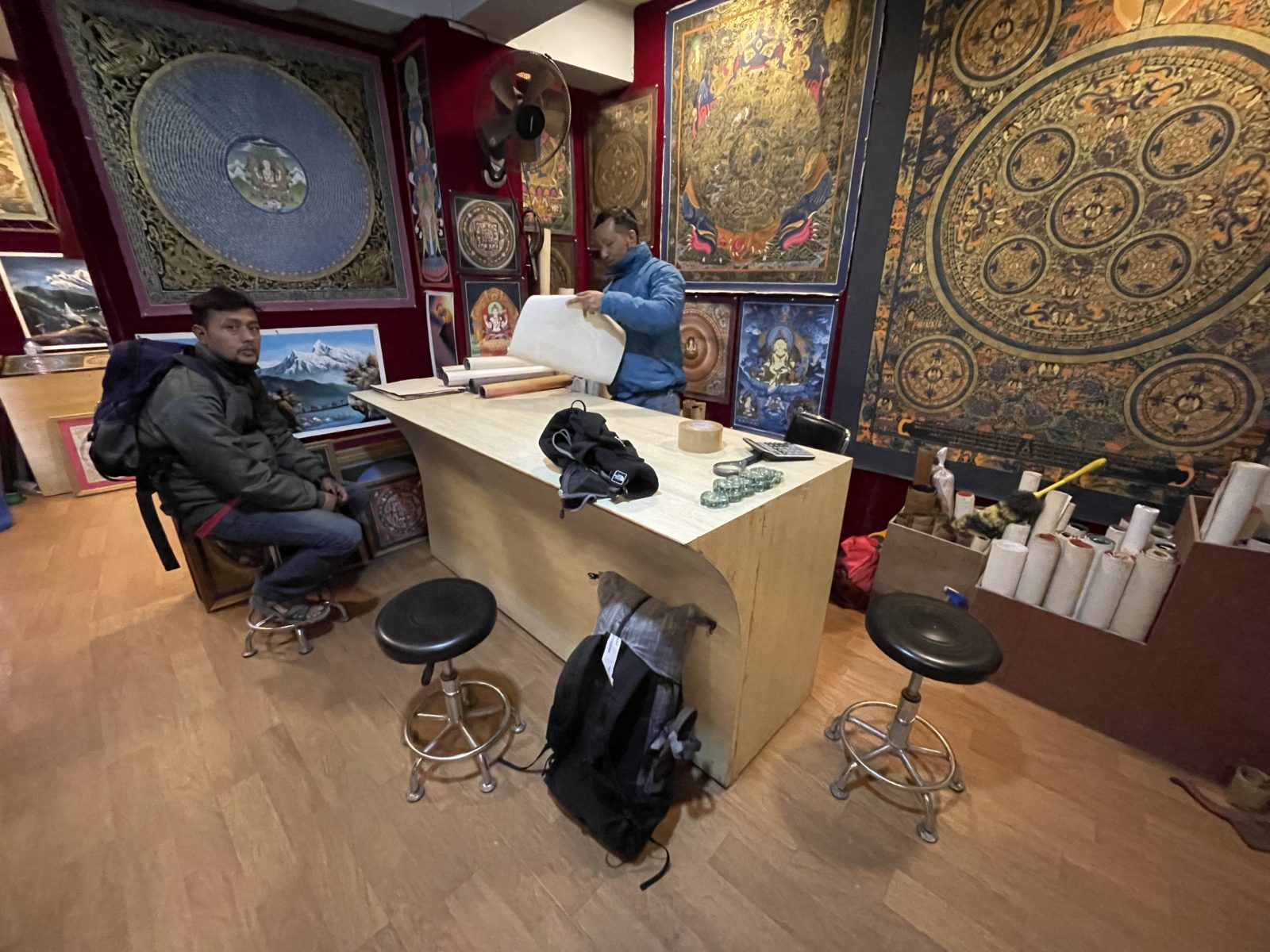 Jak tak kráčím po ulici, tak se mě ujme nějakej borec. Že už dlouho nepotkal žádného turistu a rád turistům pomáhá a baví se s nima. Jsem trochu podezřívavej, většinou všem jde ve výsledku o nějaký business. No ale směnárny mají všechny stejný kurs, takže mi je jedno, do které mě zavede. A pak ještě k bankomatu. A pak do nějaké místní restaurace, která je skutečně místní a ne turistická, takže jsem spokojený. Pak že mi ukáže jejich obchod, že dělá mandaly. Tak ok, to mě nezabije. Chvilku si nechám ukazovat jednotlivé mandaly. Prý bych si měl nějakou koupit a donést do chrámu v Langtangu a že mi ji tam posvětí. Vysvětlím jim, že kupovat nic nebudu. Celkem to berou. Loučím se.