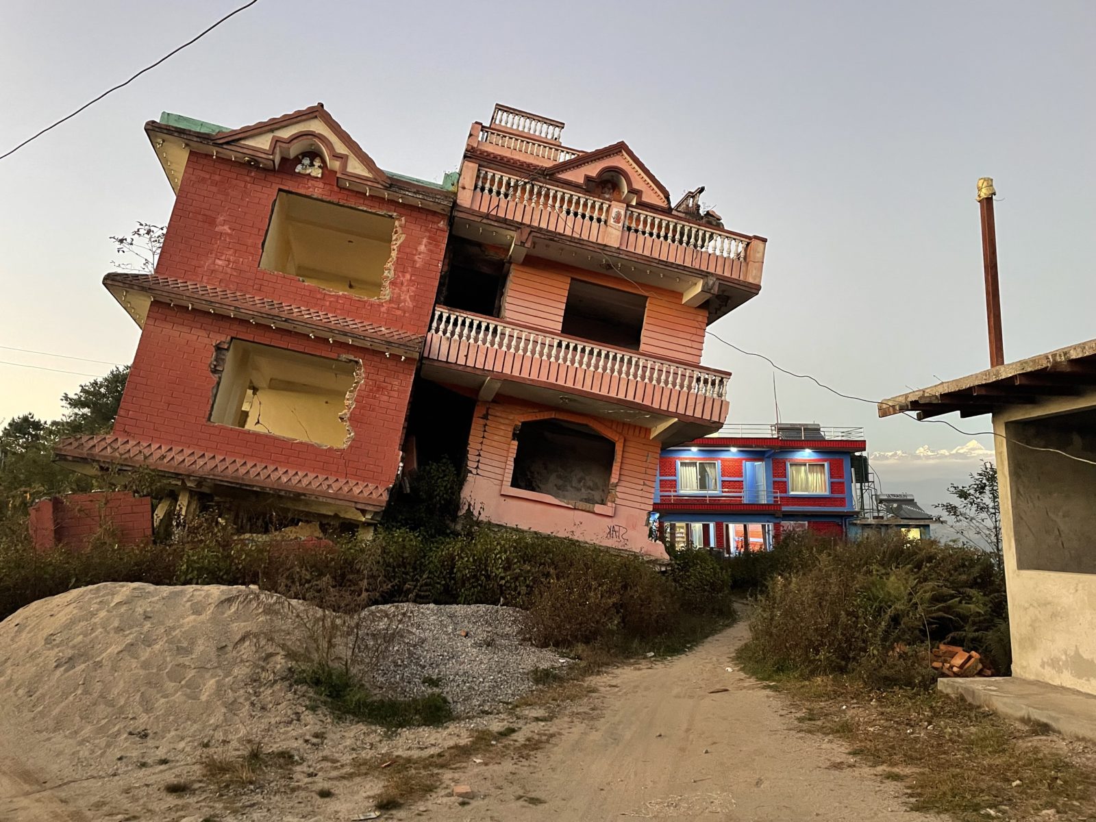 Ve vesnici stojí několik domů úplně nakřivo jako memento zemětřesení v roce 2015.