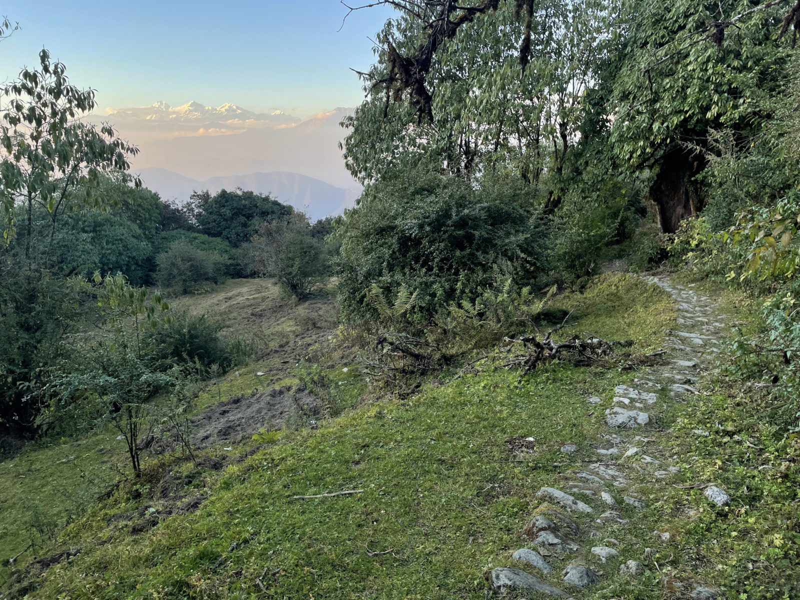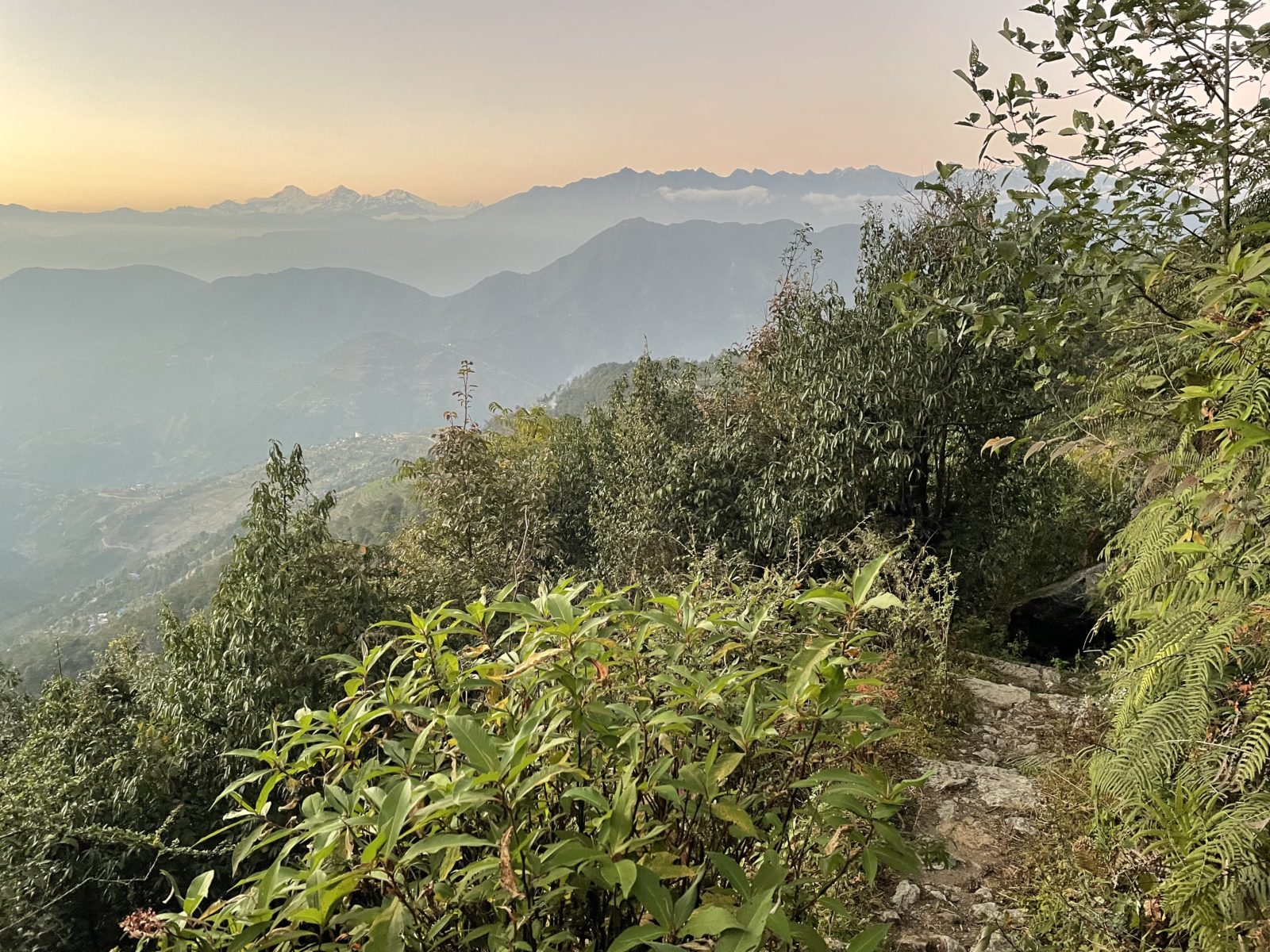 Asi v 16:50 jsem konečně v sedle ve výšce 2450 m. Teď už je to jen mírně z kopce. Asi 10 minut po západu slunce, v 17:25 dojdu do vesnice Chisapani (2200 m). Pomalu se stmívá a mně se naskýtá krásný pohled na hory v dálce.