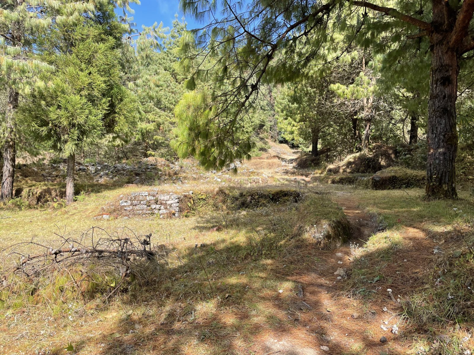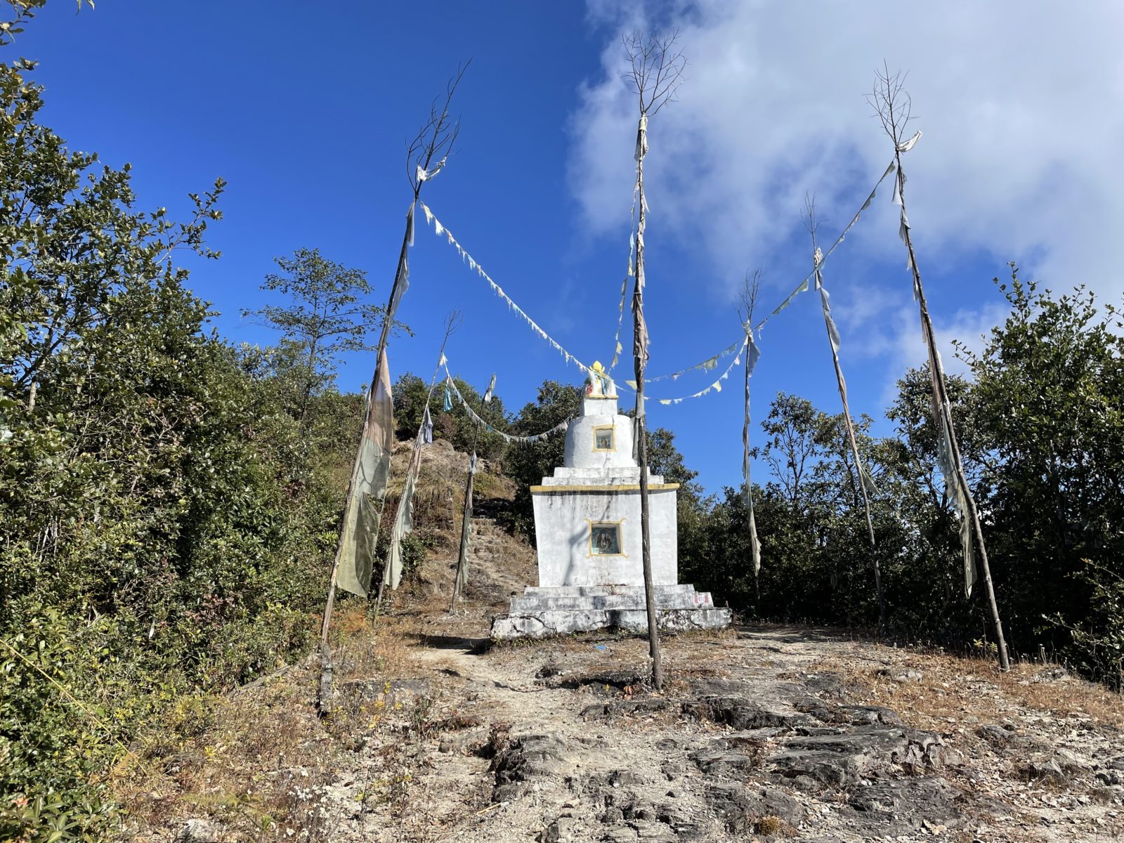 A pak začne stoupání. Hlavní cesta má serpentýny, pěší stezka je křižuje přímo nahoru. Je to celkem prudké. Procházím vesnicí Chipling.