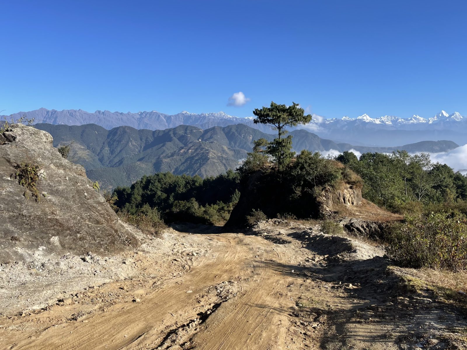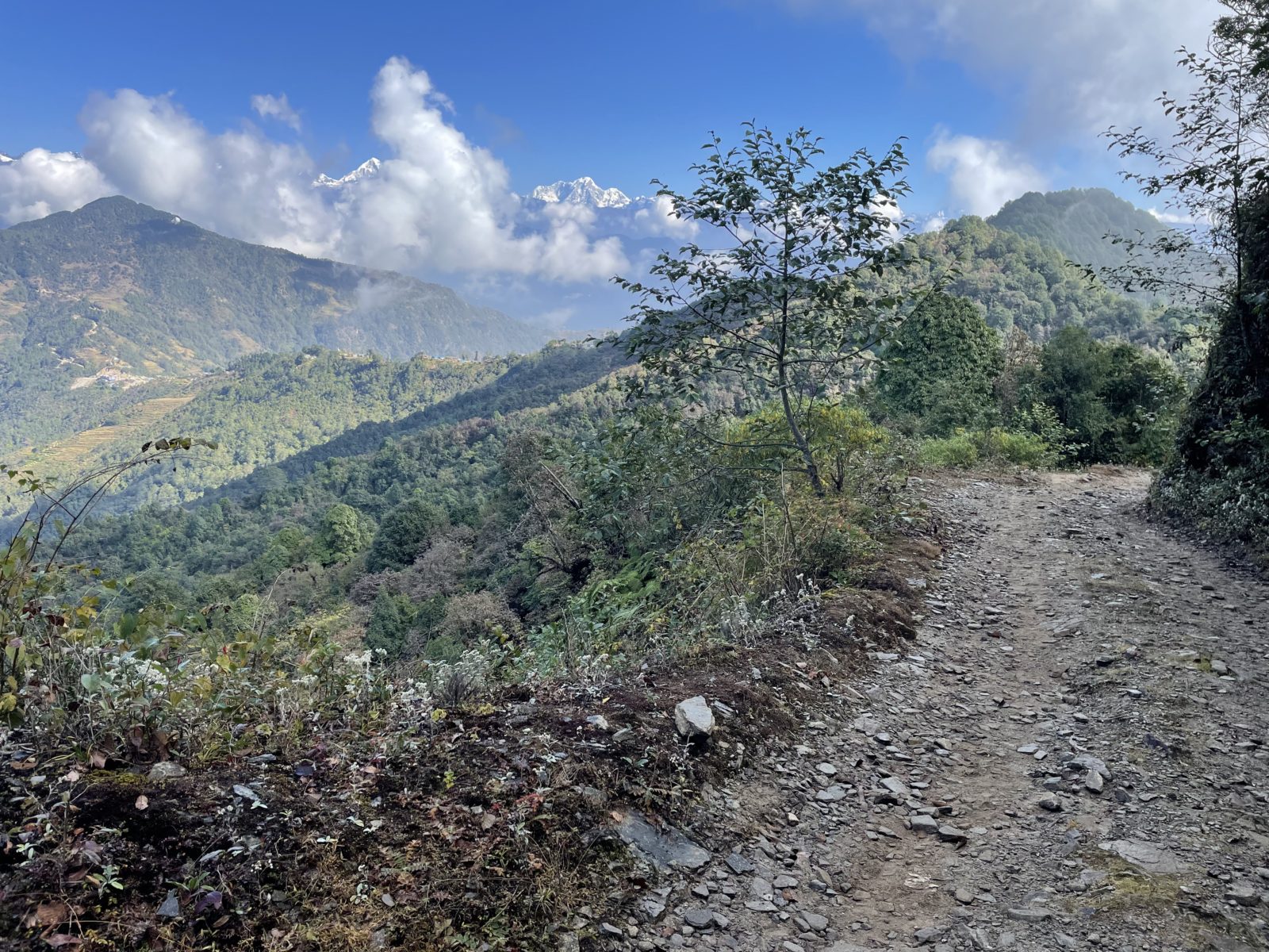 Pokračuju dál. Jak jinak, opět do kopce. Tentokrát do výšky 2550 m, pak mírně dolů do vesnice Kutumsang (2450 m). Tady si dávám palačinku a čaj (400 Rs, 100 Kč). Celkem to trvá, ale je to dobré a aspoň se trochu zasytím.
