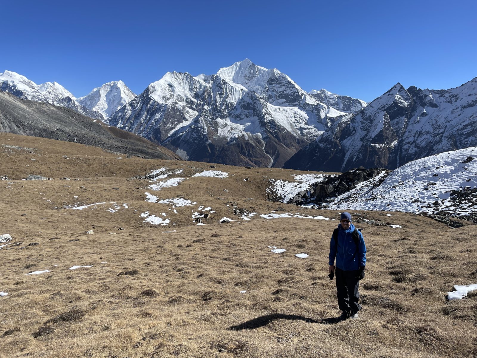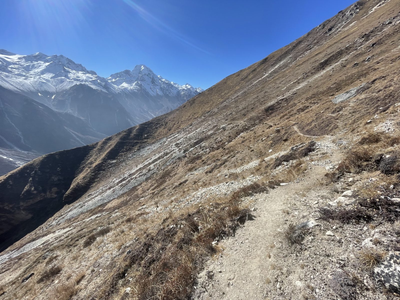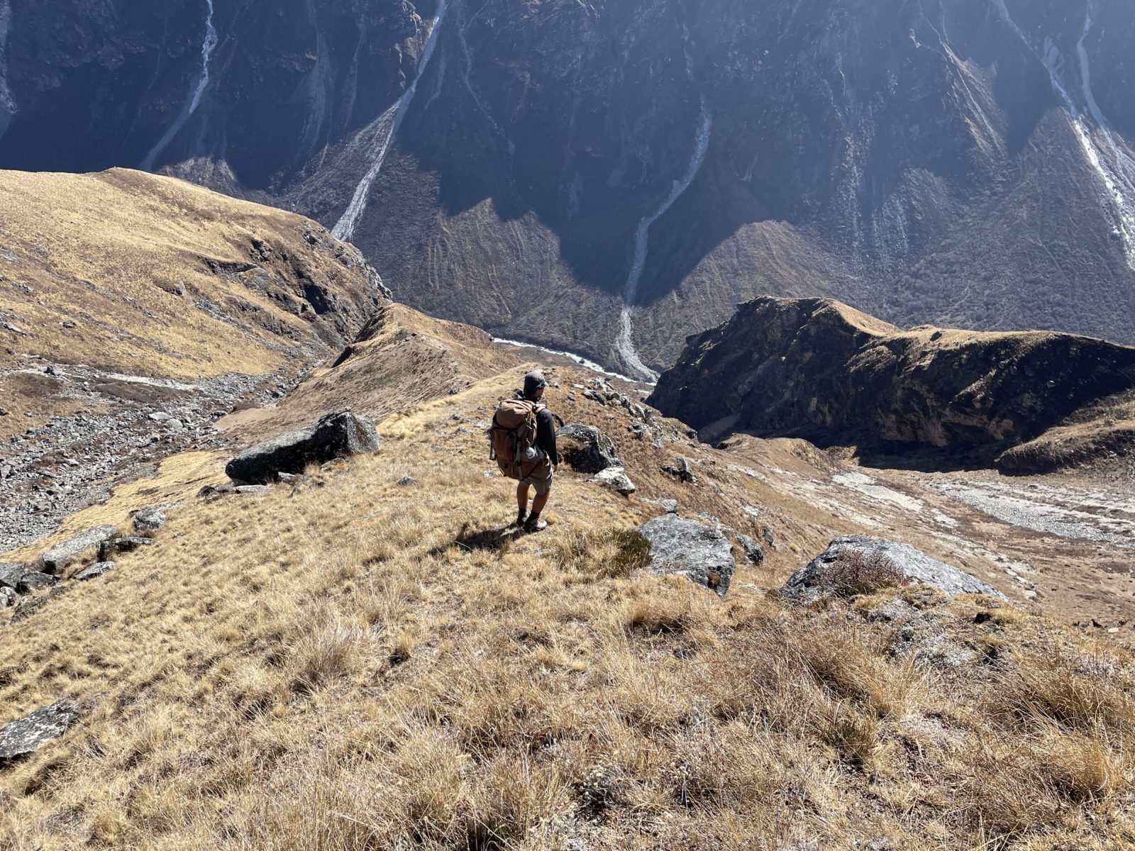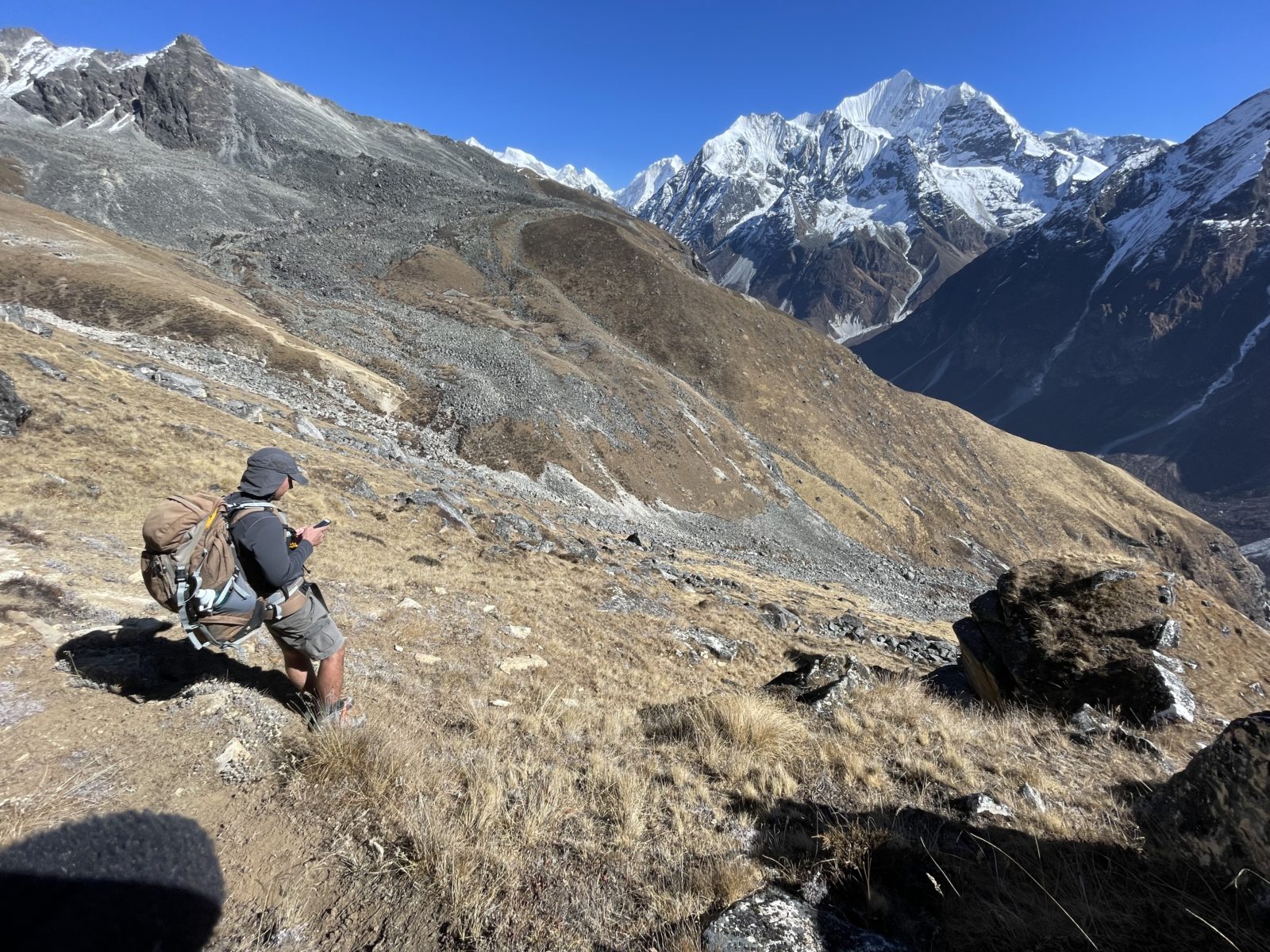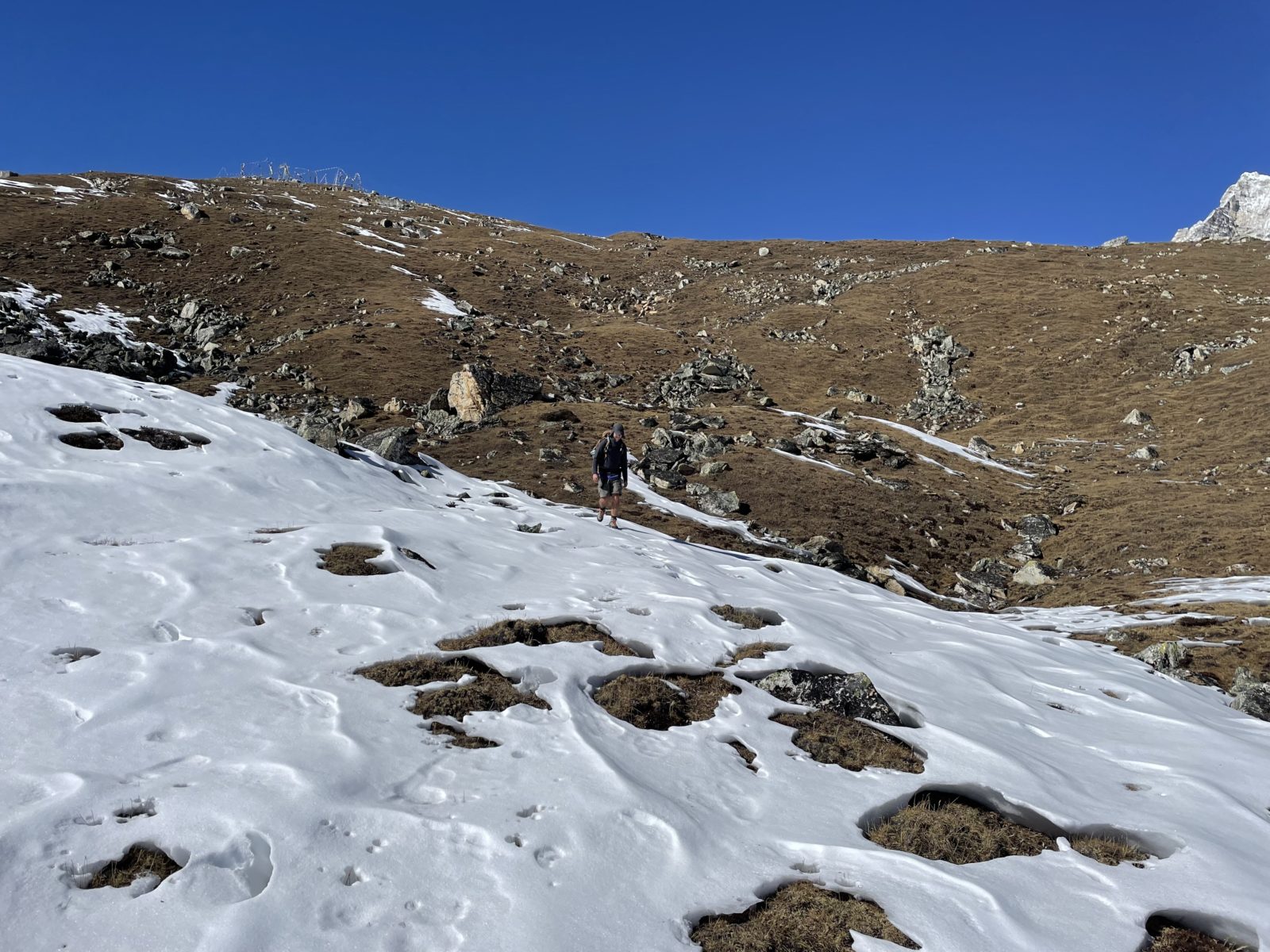 Domlouváme se s Michaelem, že půjdem dolů alternativní cestou naokolo – směrem dál na východ a dolů a pak nad údolím zpět do Kyanjin Gompy. Vyrážíme asi ve 12:45 nebo tak nějak. Je tu trochu sníh, ale sklon je velmi mírný, tak to jde.