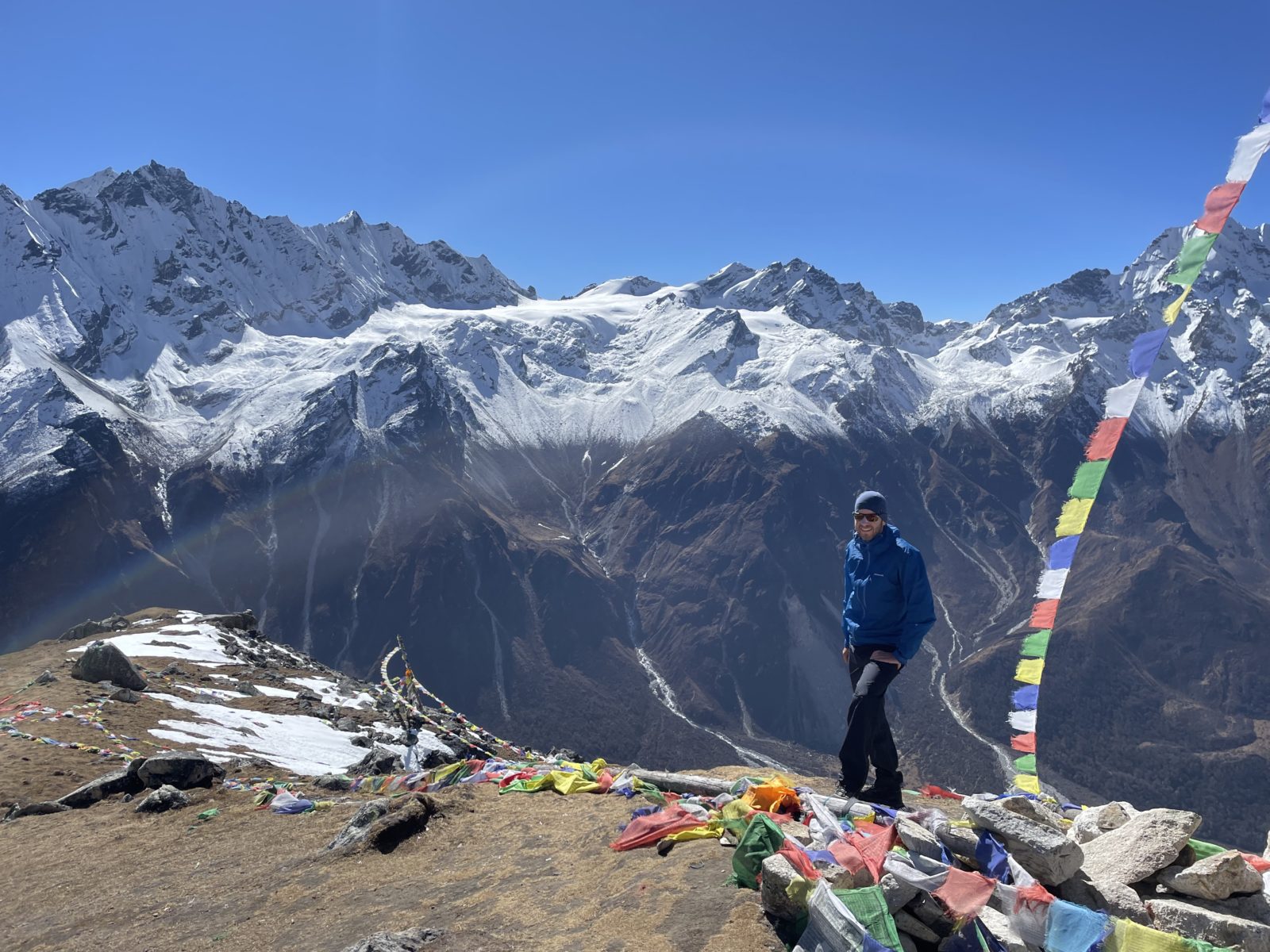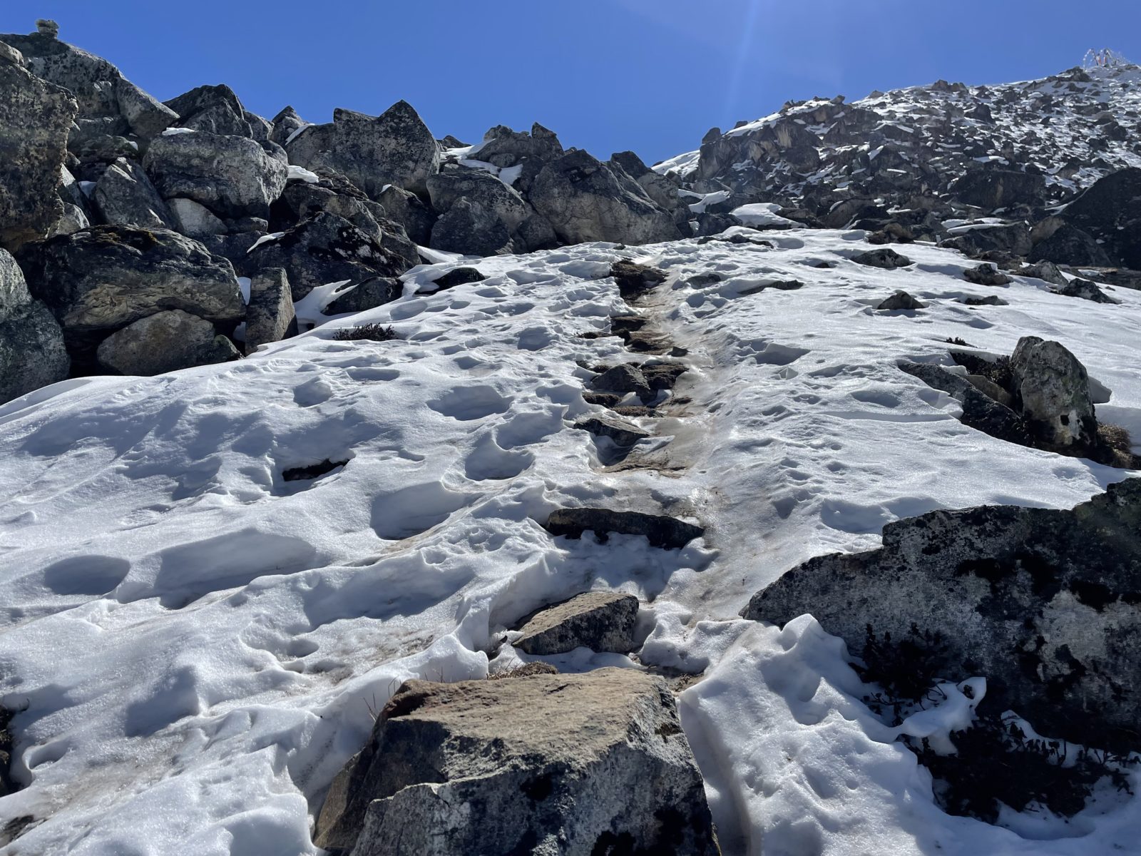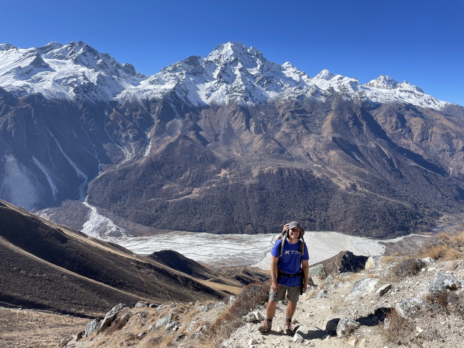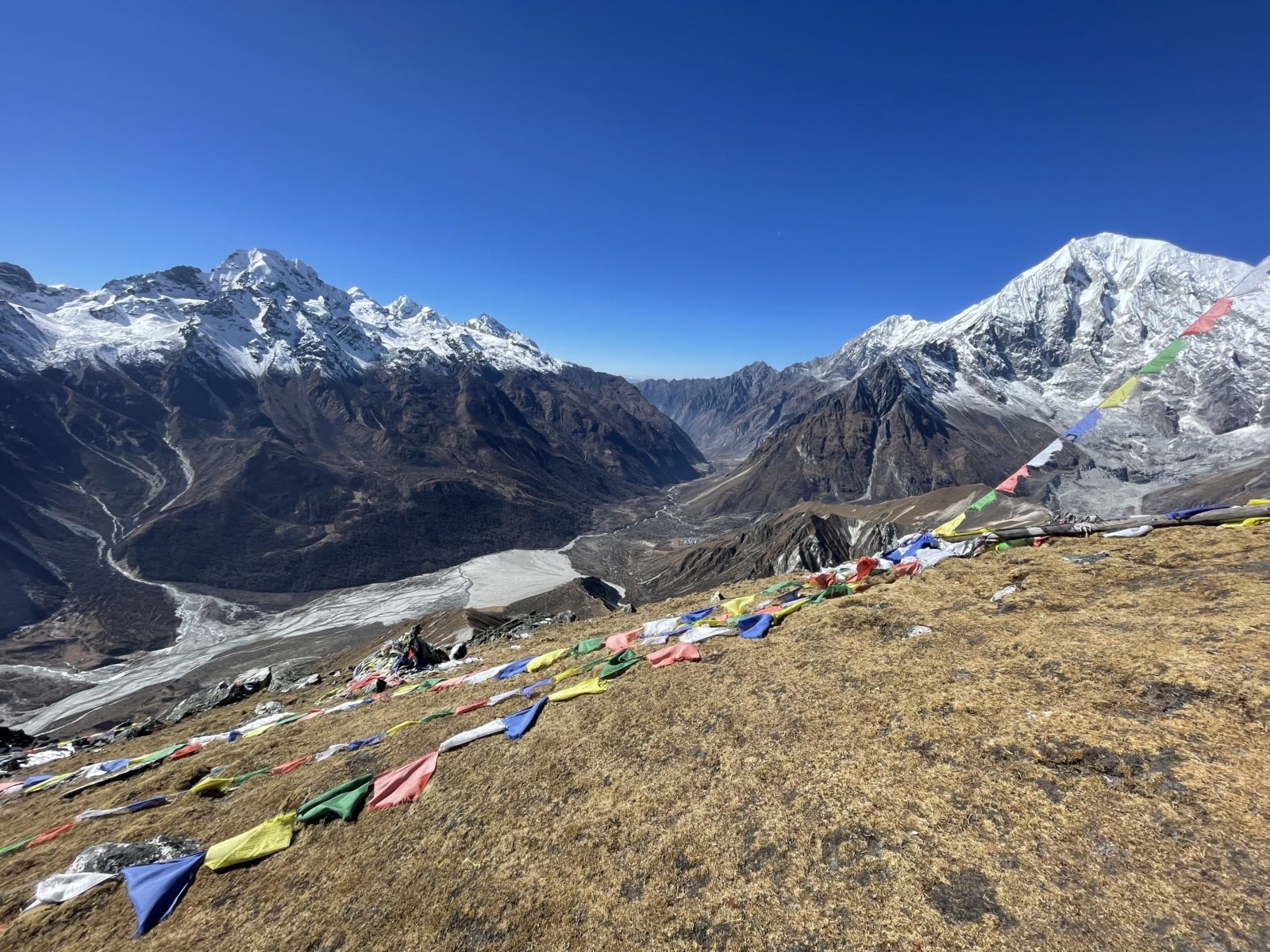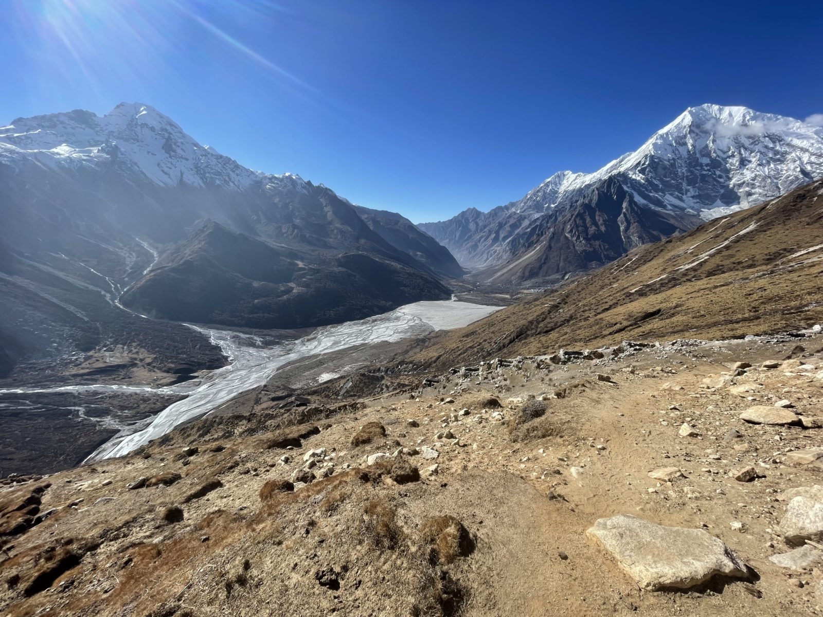 Domlouváme se s Michaelem, že půjdem dolů alternativní cestou naokolo – směrem dál na východ a dolů a pak nad údolím zpět do Kyanjin Gompy. Vyrážíme asi ve 12:45 nebo tak nějak. Je tu trochu sníh, ale sklon je velmi mírný, tak to jde.