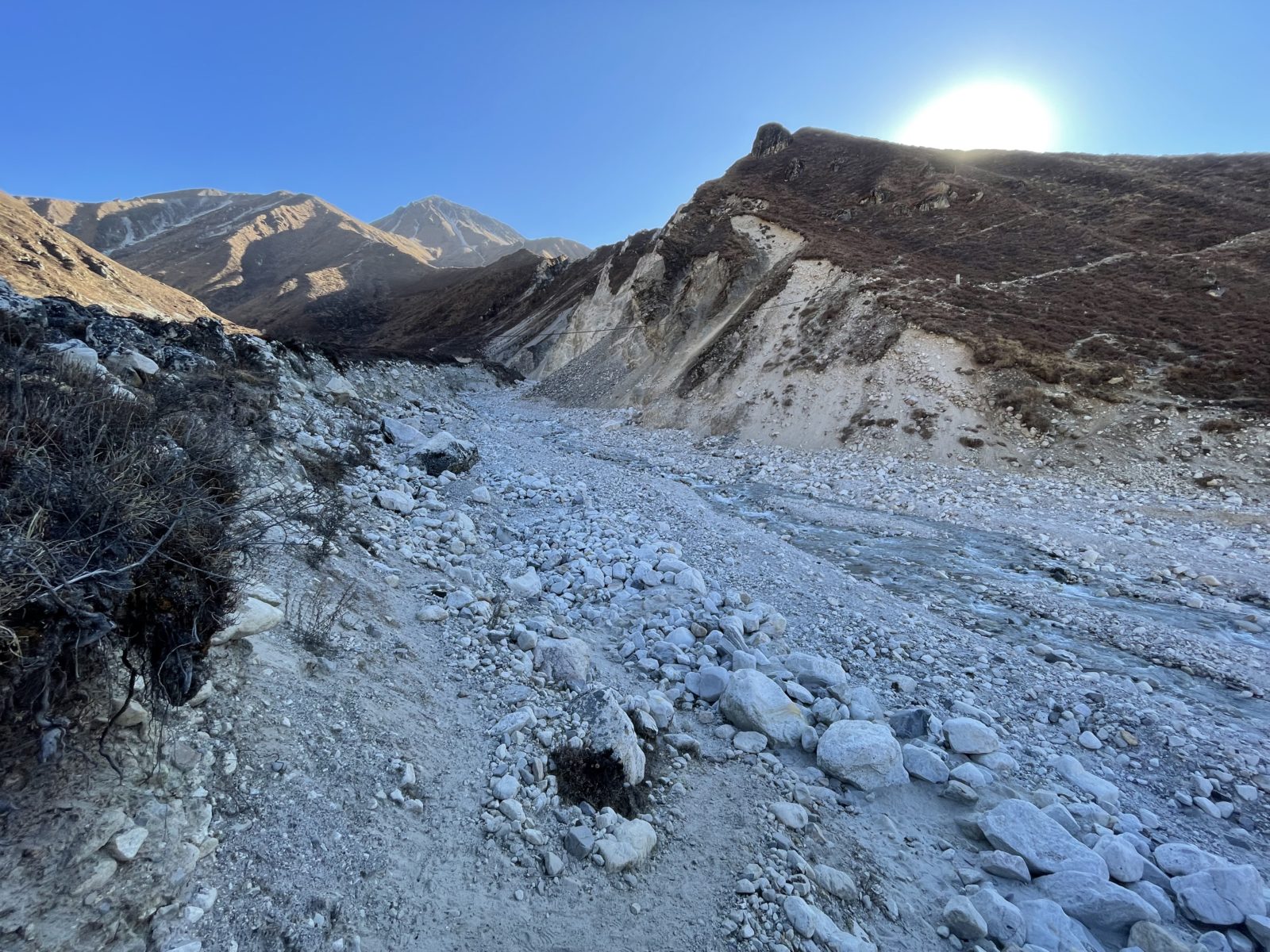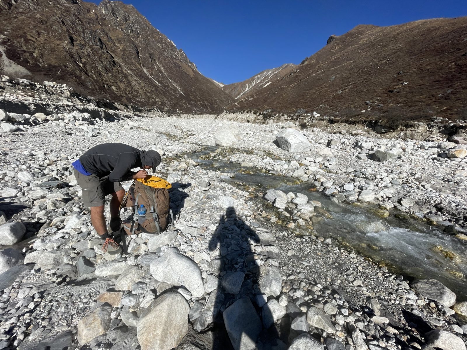 Vstávám, snídám. Vyrážím v 8:34. Chystám se nejkratší cestou na vrchol Tserko Ri (4985 m). Jdu nad hlavním údolím směrem na východ. Je tu několik možností. Vybírám si tu vyšší cestu. Po 20 minutách dojdu k řece. Je to boční přítok do hlavního údolí.