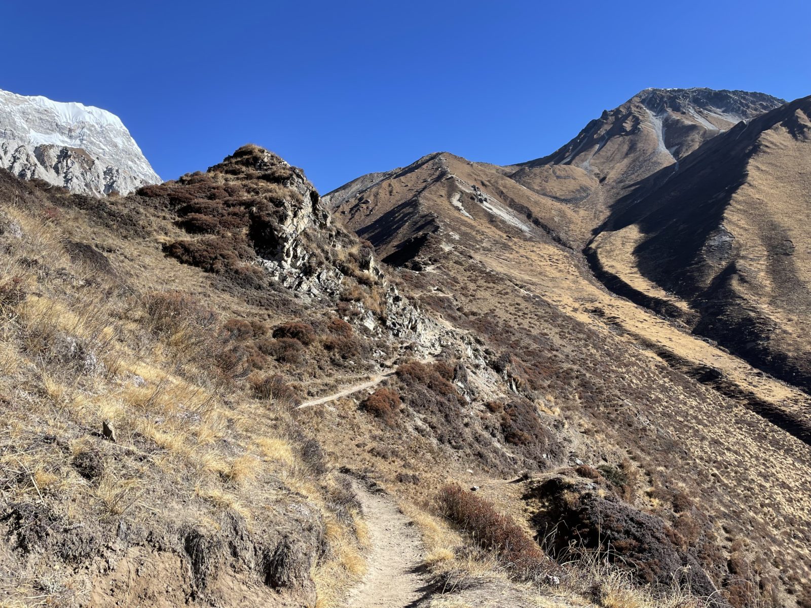 Brzo se dostaneme na krásnou cestu, která je zařezaná ve svahu. Teď už to bude pohoda – tato cesta nás zavede až k začátku stoupání na Tserko Ri, kde jsme byli ráno. Je to krásná vyhlídková cesta! Udělali jsme dobře!